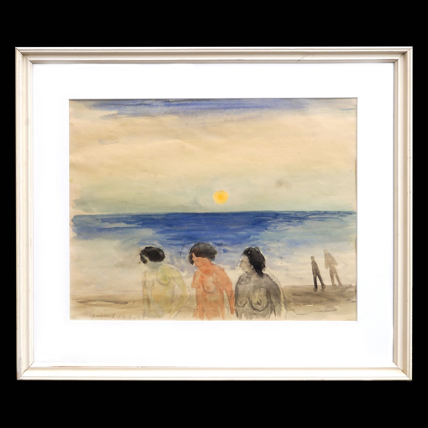 Watercolor by Jens Søndergaard, 1895-1957: "Women walking at the beach"
