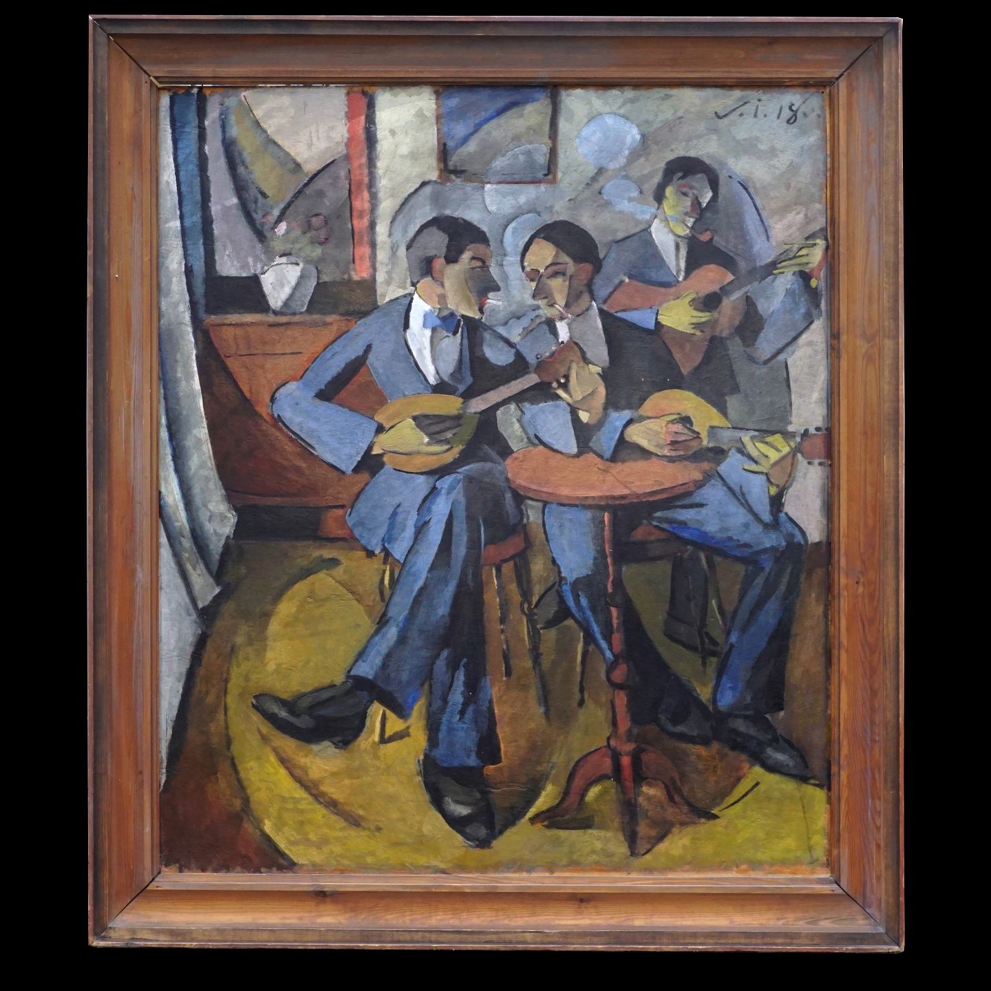 Victor Isbrand, 1897-1988, oil on plate. Cubism composition with three musicians. Signed and dated 1918. Exhibited and depicted. Visible size: 105x88cm. With frame: 121x106cm