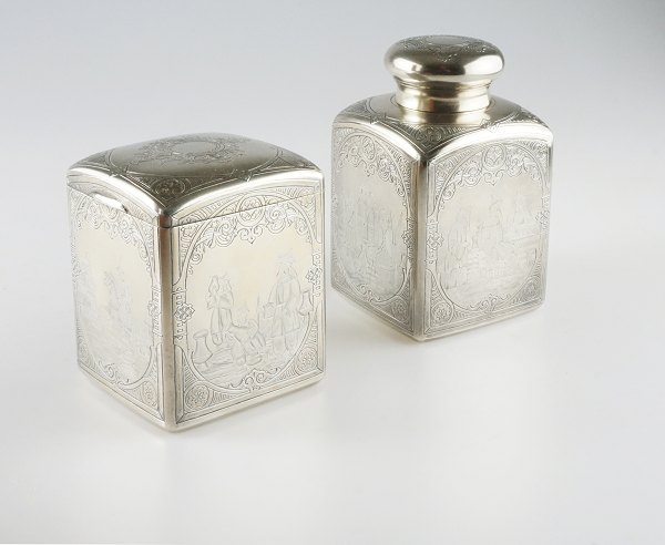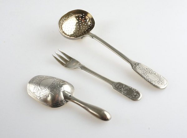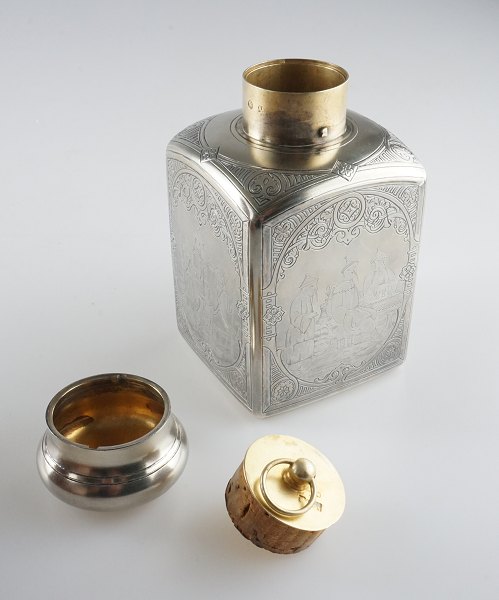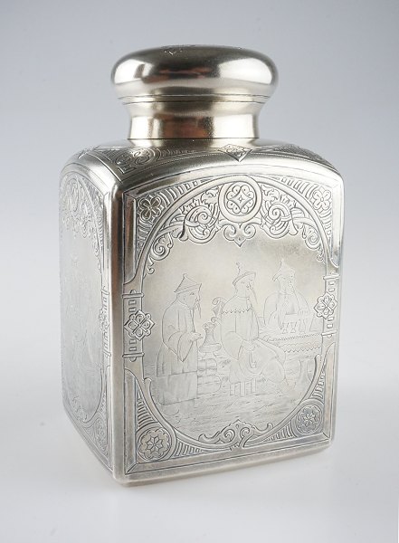 Russisk rejseskrin med indhold i sølv bestående af dåse, flaske, doseringsske, strøske og gaffel