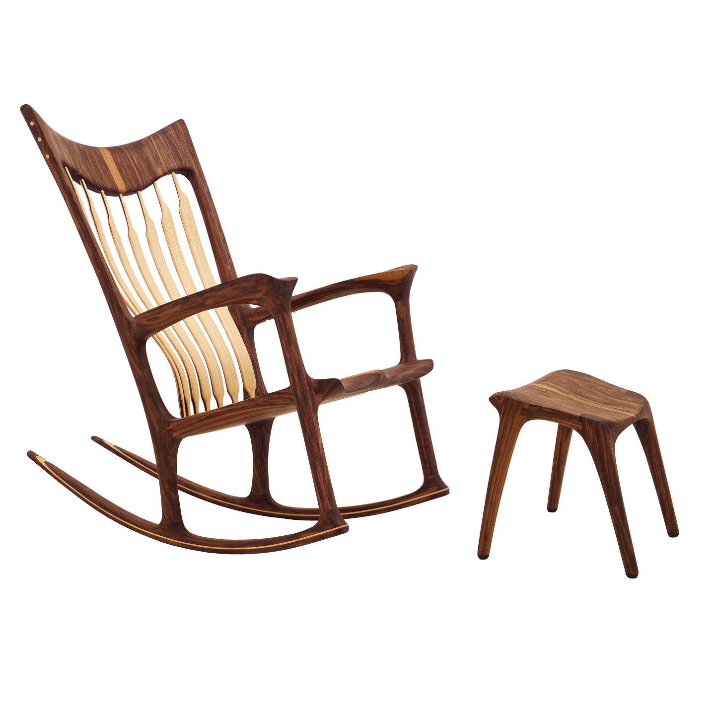 Dansk snedkermestermøbel. Gyngestol i nøddetræ og ask med fodskammel. Fremstillet og signeret af Morten Stenbæk