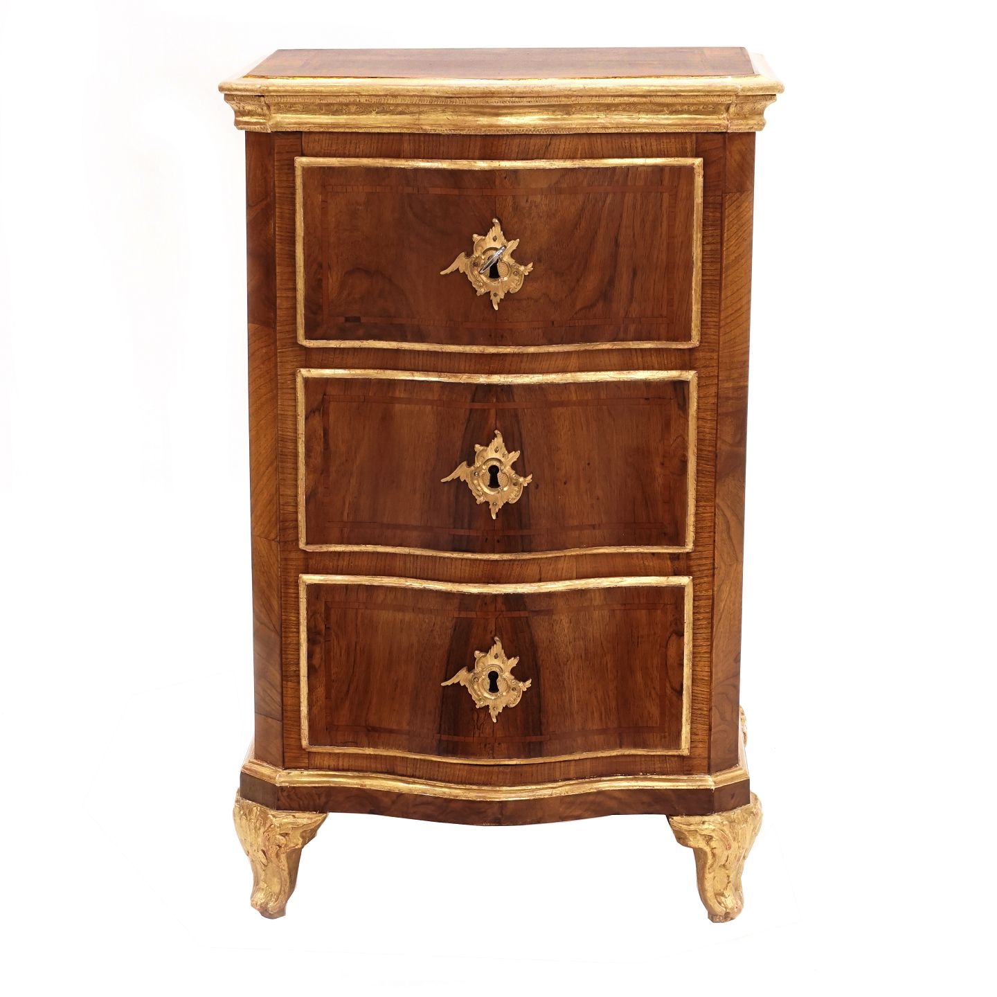 Lille dansk ligesidet barok nøddetræskommode med forgyldninger