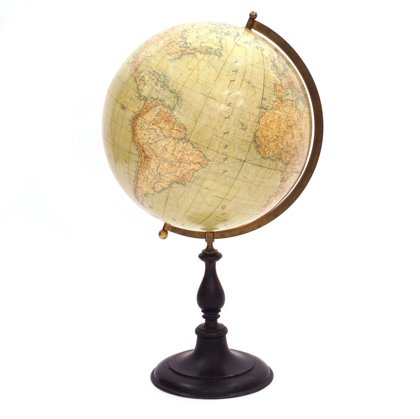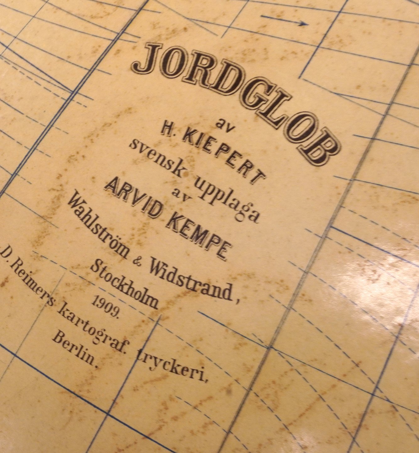 Stor dekorativ globus 1909. Stor "Jordglobus" af Arvid Kempe, Stockholm, 1909 på træfod. H: 98cm. D: 50cm