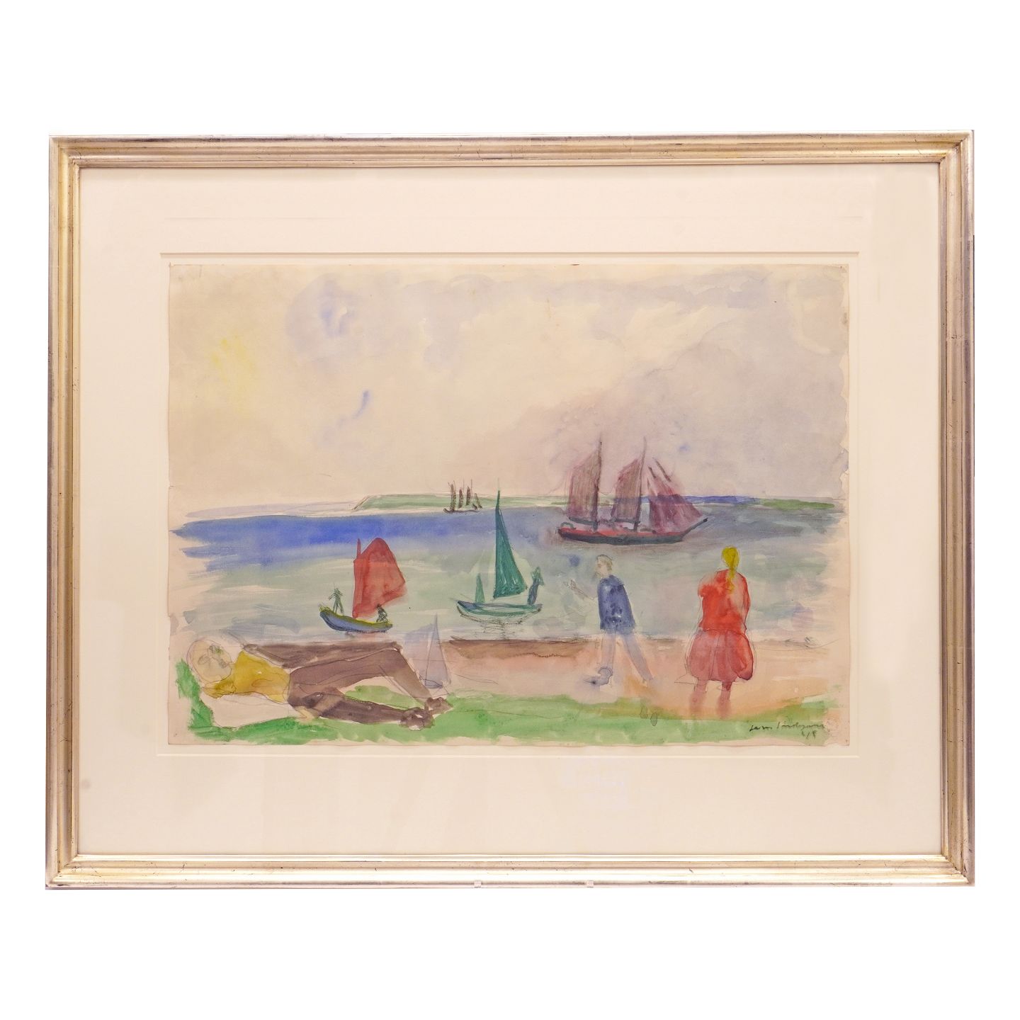 Jens Søndergaard, 1895-1957, akvarel med motiv i form af fjordlandskab med mennesker og skibe