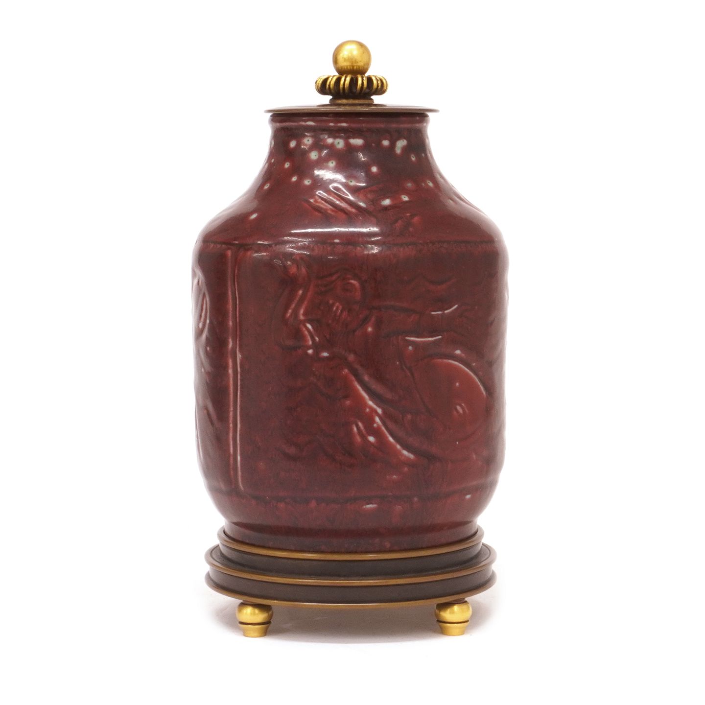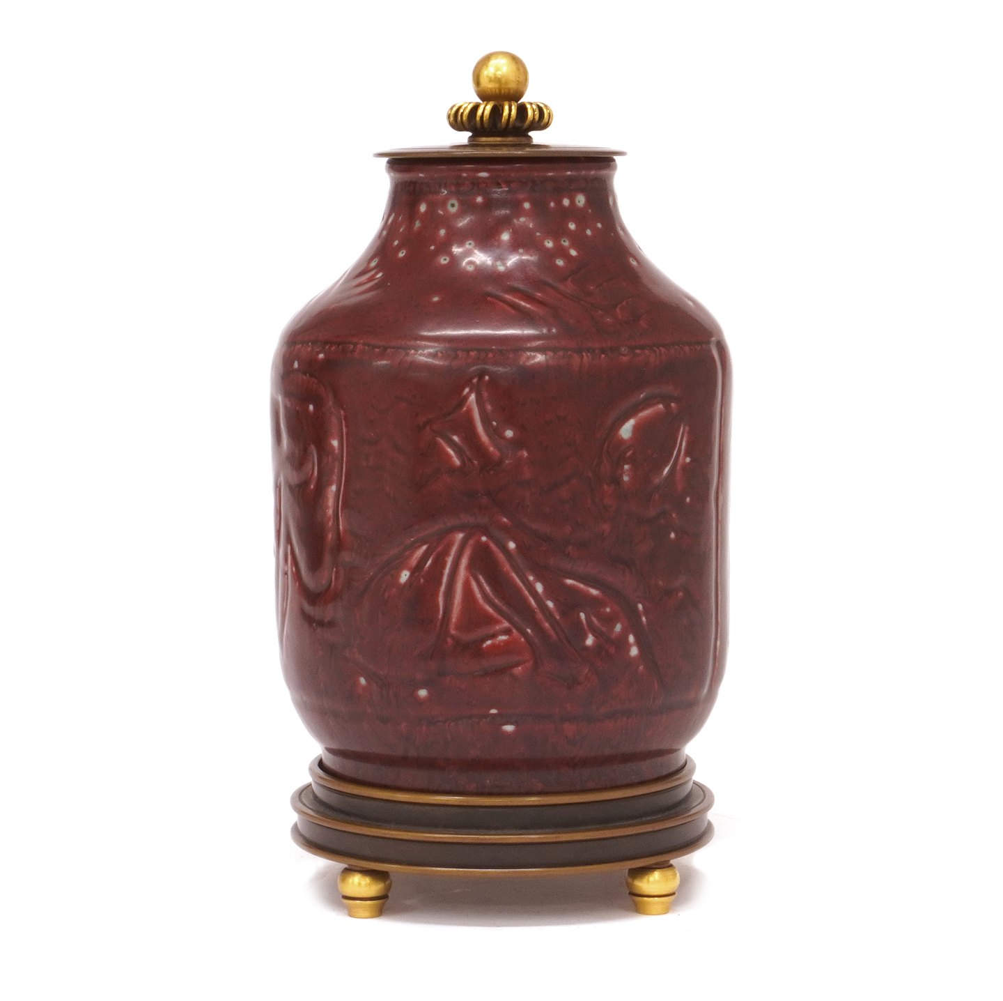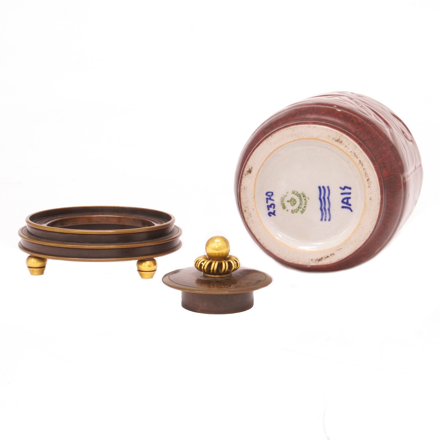 Jais Nielsen, 1885-1961, for Royal Copenhagen: Lågvase i okseblodsglasur med patineret og delvist forgyldt bronze standring og låg af Knud Andersen. Motiv "Jonas & Hvalen"