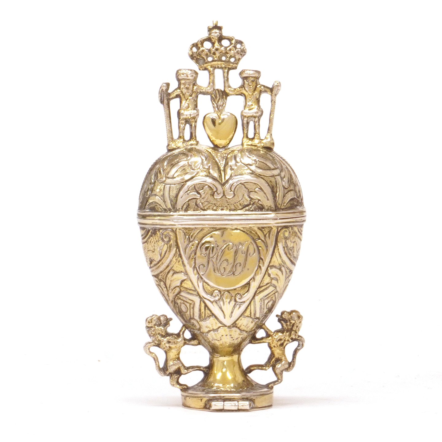 Forgyldt Amageræg med krone, vildmænd og løver. Mester Martin Westrup, København, 1788-1838. Dateret 1805. H: 10,1cm