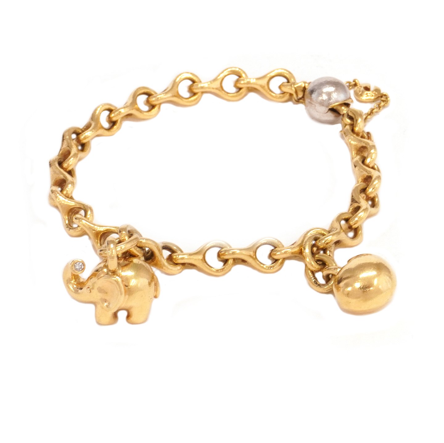 Ole Lynggaard 8-tals armlænke i 14kt guld med charms i form af elefant og hjerte. Kuglelås delvist hvidguld