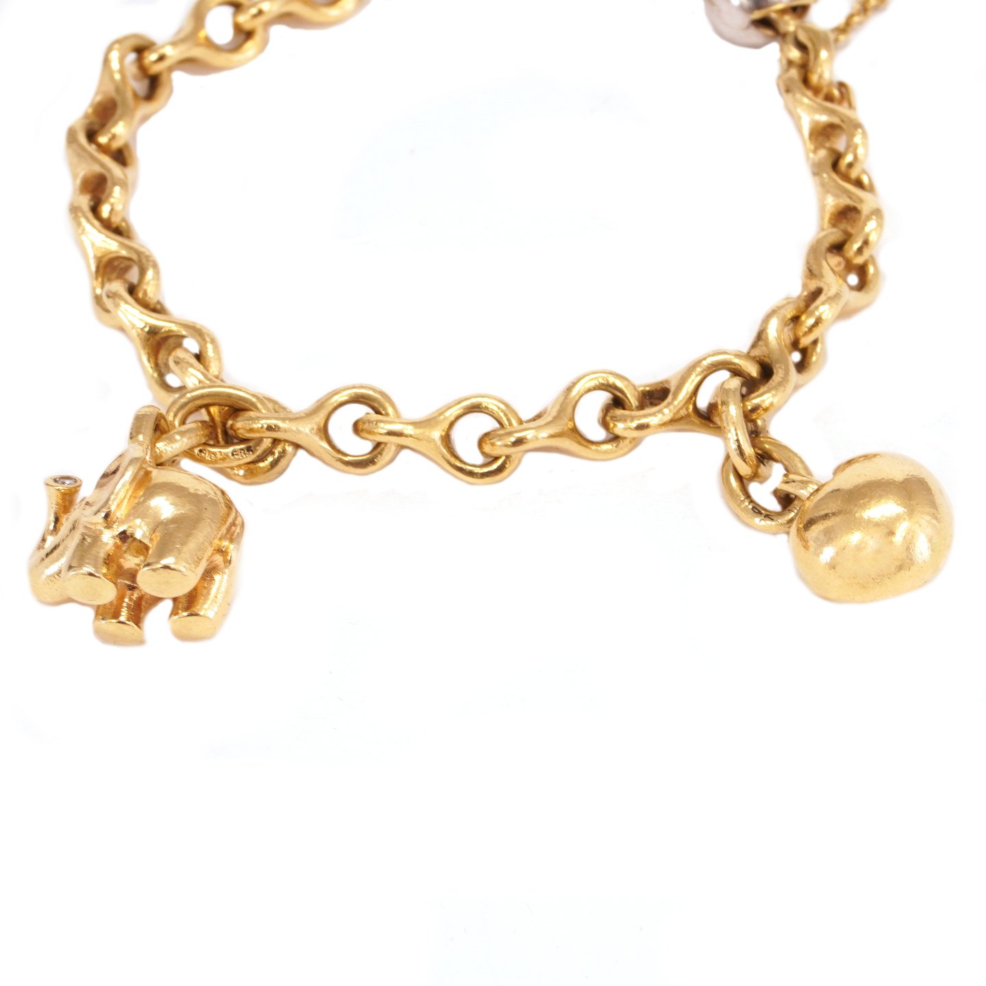 Ole Lynggaard 8-tals armlænke i 14kt guld med charms i form af elefant og hjerte. Kuglelås delvist hvidguld. Ledstr. 7x13mm