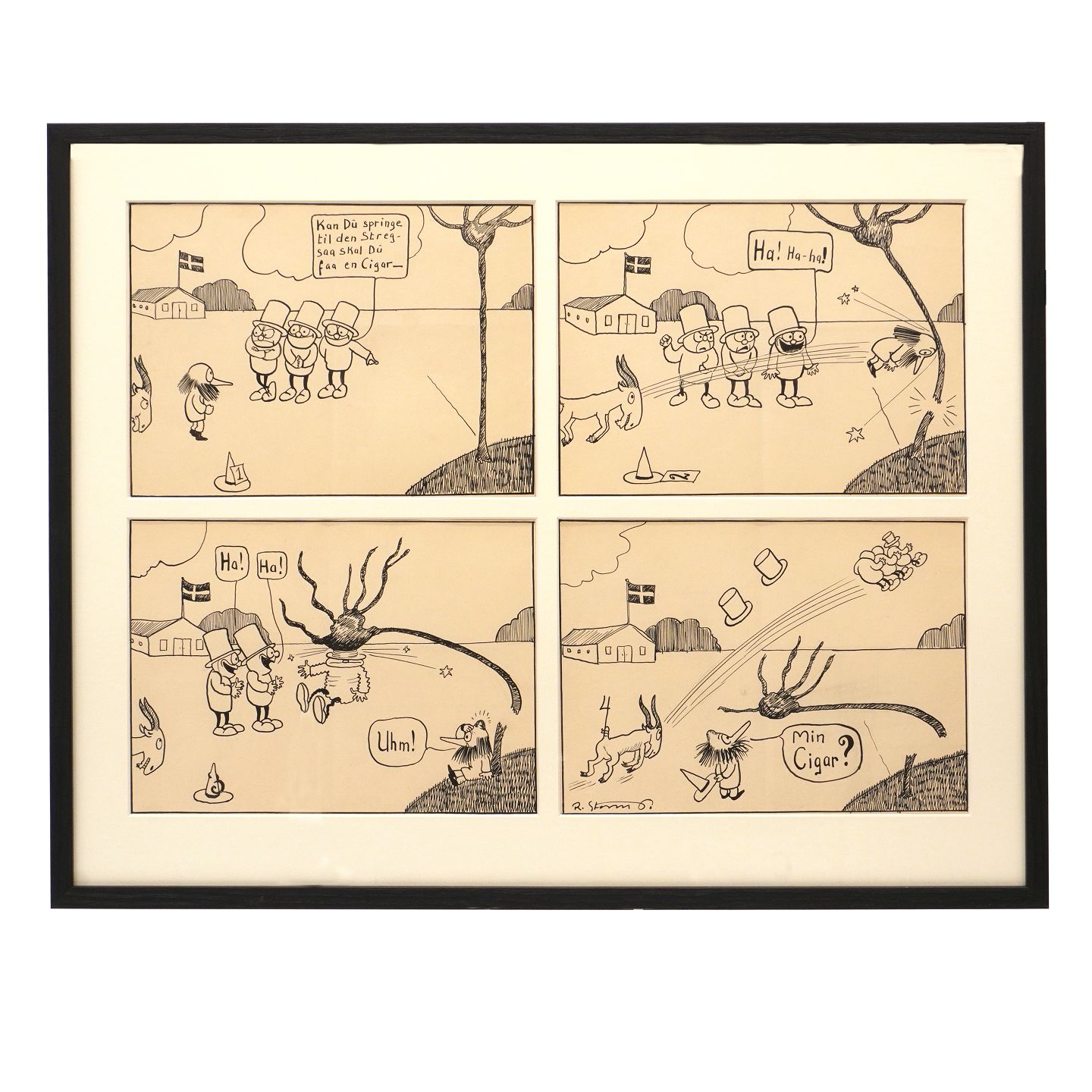 Storm P. Tegning. Robert Storm Petersen, 1882-1949, blyant og tusch. Fire originaltegninger bragt i "Verden og Vi" 1913-16, hvor "De Tre Små Mænd" og "Nummermanden" blev introduceret. Hver tegning måler ca. 20x27cm. Mål med ramme: 52x65cm