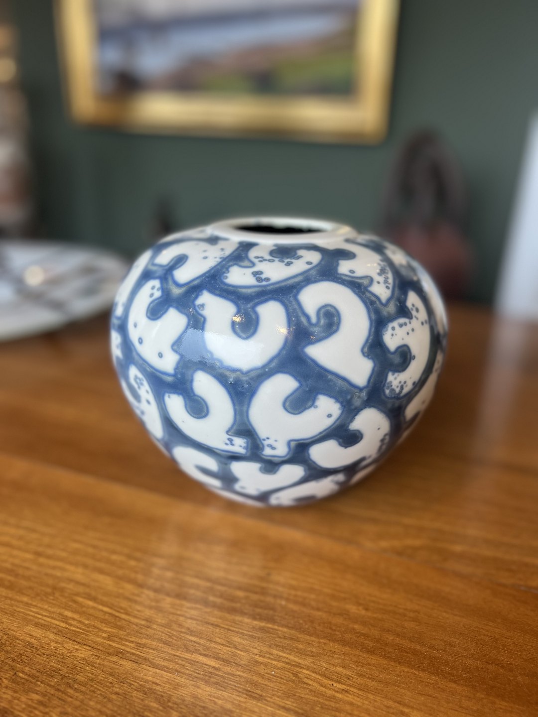Per Weiss vase. Per Weiss, 1953-2023, vase i stentøj med blå glasur og geometrisk mønster. H: 20cm. D: 20cm