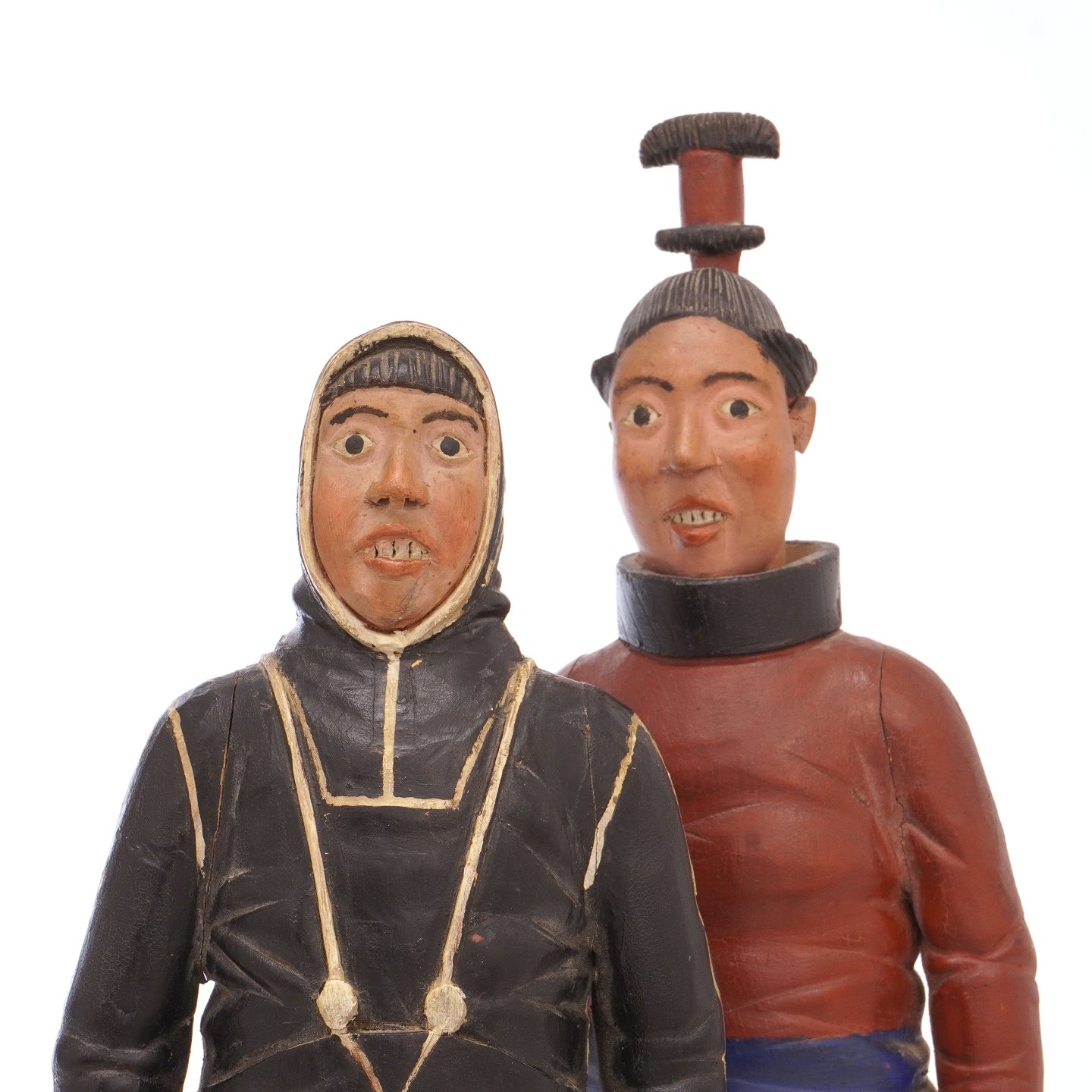 Johannes Kreutzmann, 1862-1940, greenlandic folk art, pair of wooden figures depicting a Greenlandic man and woman both signed. H: 39&45cm