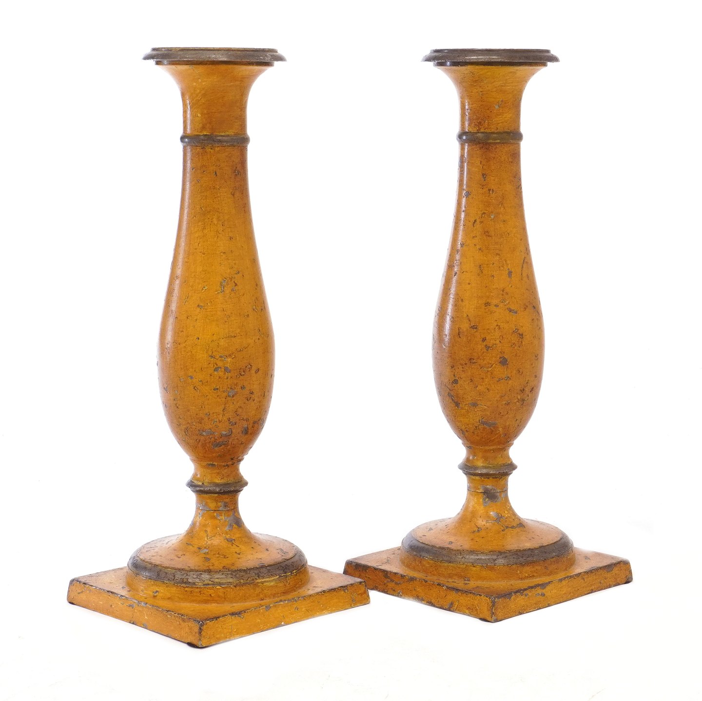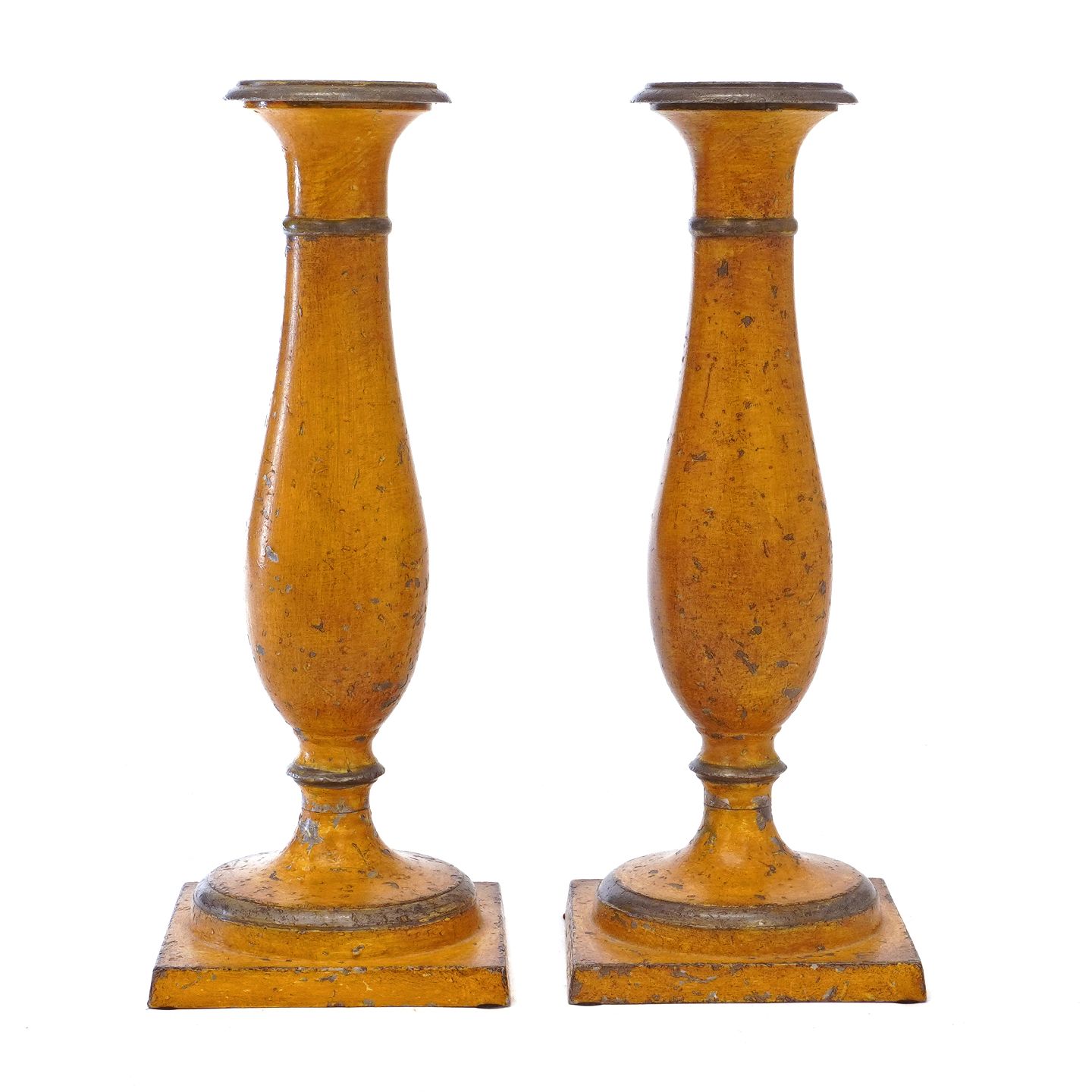 Et par mørkegule originaldekorerede tulipanstager udført i tin. Danmark ca. år 1840. H: 21cm