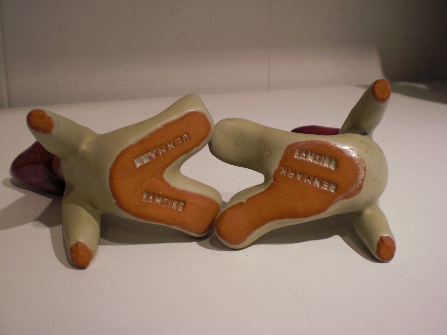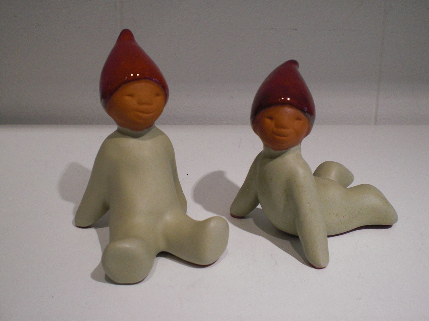 Liggende og siddende nisse i keramik udført af Ramsing Keramik, Holbæk ved Vibeke Utke Ramsing (død 1990) ca. 1970. Højde: ca. 7 cm. cm. I fin stand.