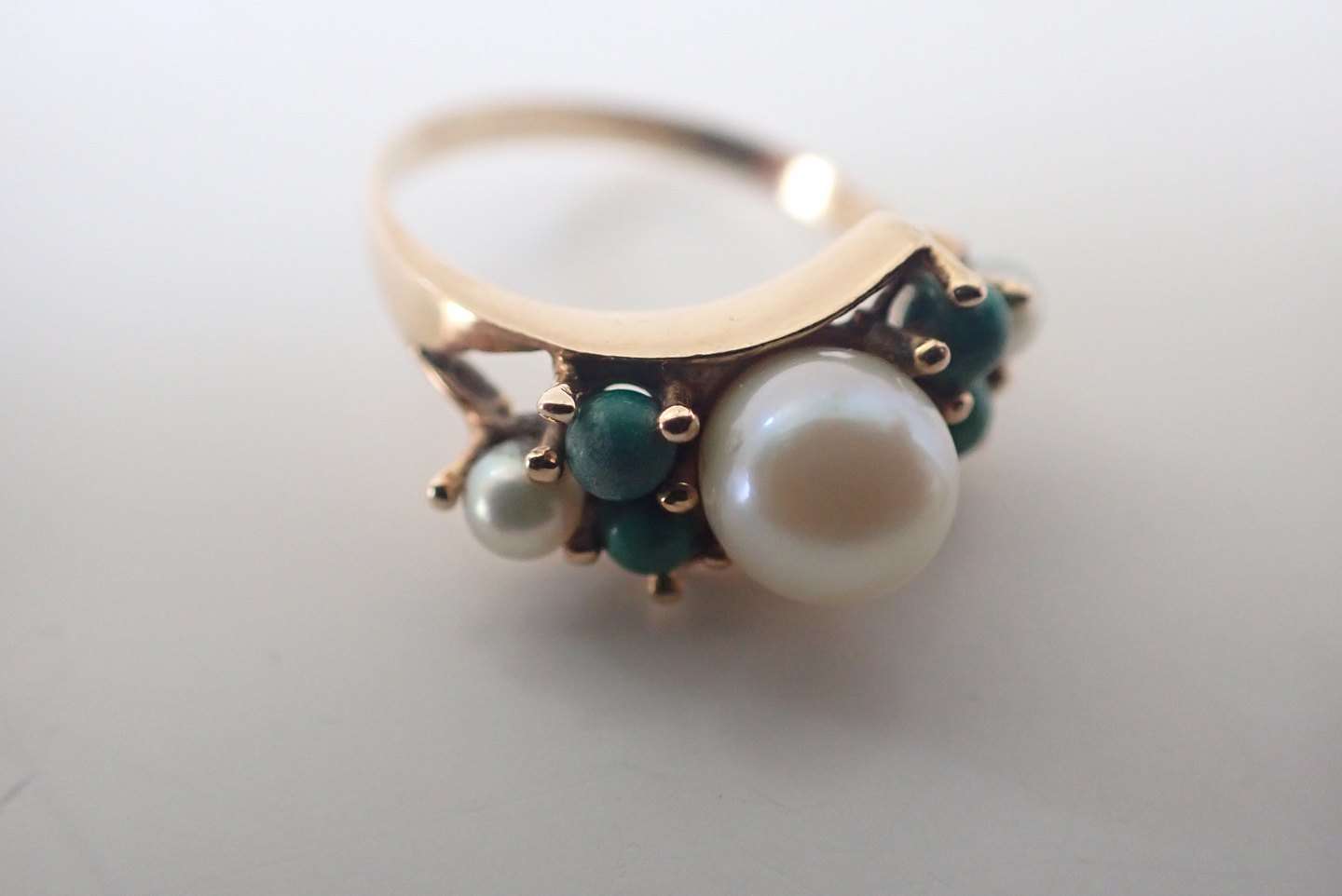 Guldring med 3 kulturperler og 4 små carbochonslebne turkiser. Ringen er udvidet og stemplet er tabt; men testet til 14 karat. Ca. 1950. Str.:57. Bredde ved perler: 0,8 cm. Ringskinne bag: 0,2 cm. I pæn stand med tidstypisk slid, turkiser grønlige.