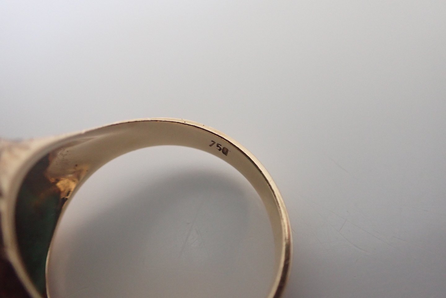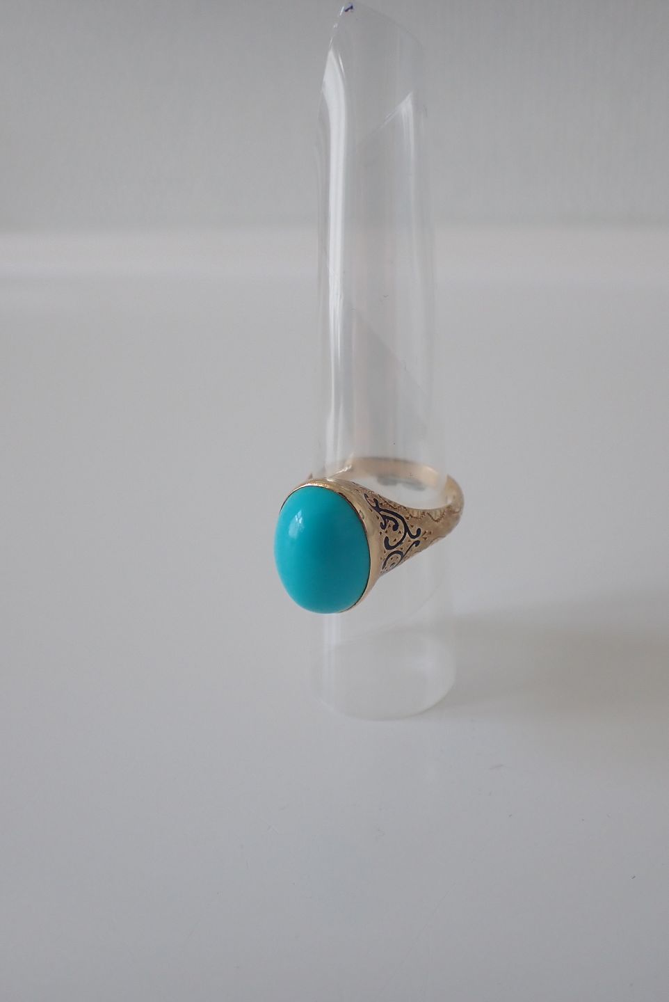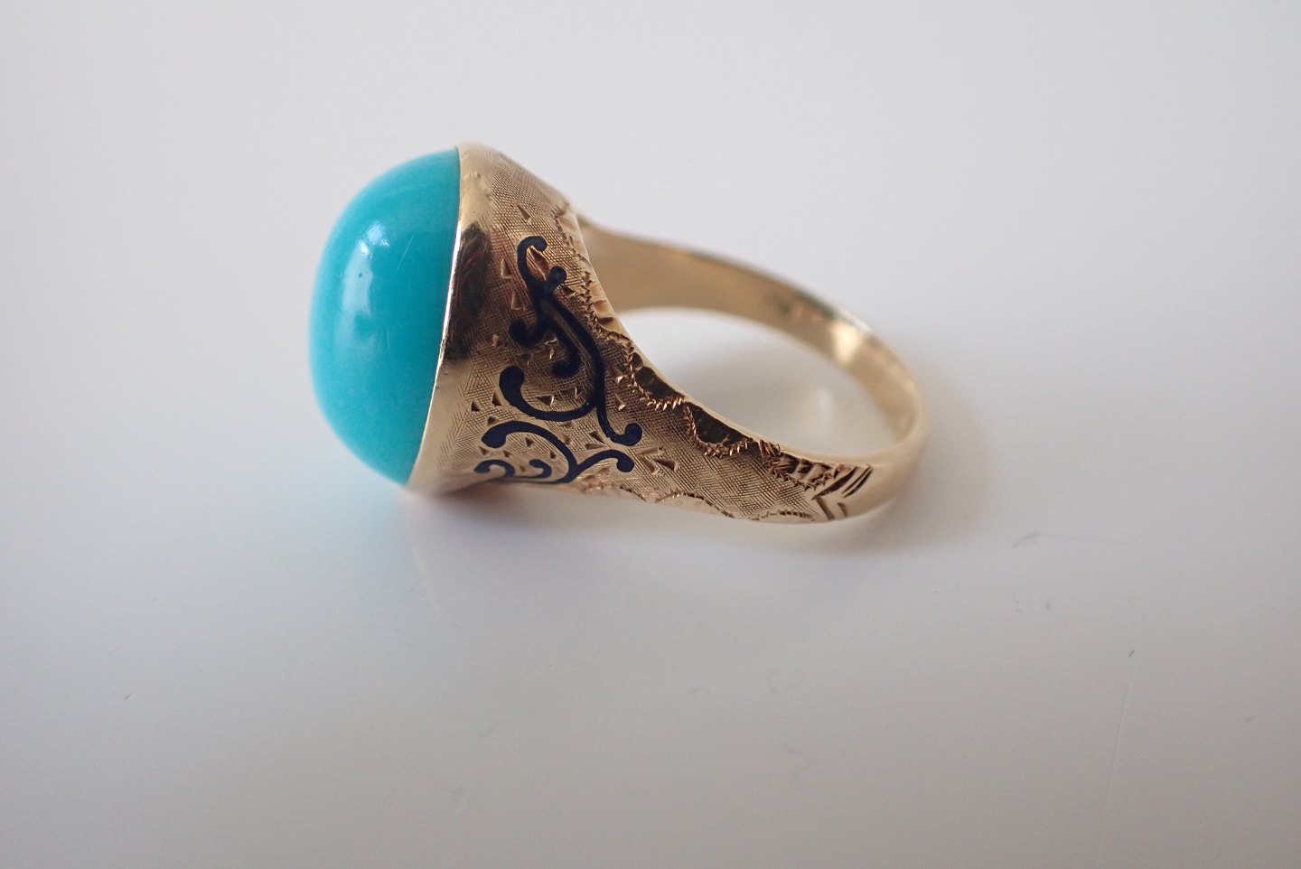 18 karat guldring med cabochonsleben turkis og blå emaljedekoration. Stemplet 18 k. Formentlig fra Nordafrika ca. 1950. Længde tykis:1,6 cm. Bredde: 1,2 cm. Bredde ringskinne: 0,3 cm. I fin stand. Turkis fin turkisfarvet.