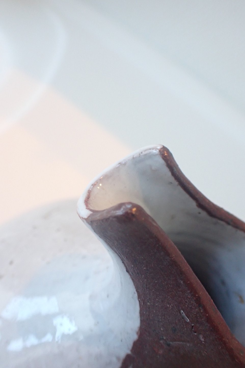 Gutte Eriksen (1918 - 2008) - spaltekande i hårdtbrændt ler med delvis, skulpturel glasering i lysegrå nuance. Ca. 1950. Højde: 14 cm. Bredeste bredde: 13,5 cm. I fin stand.