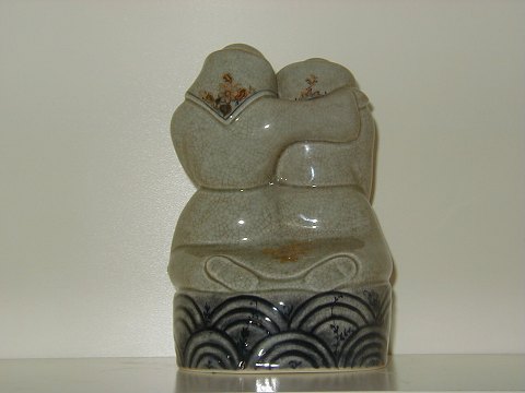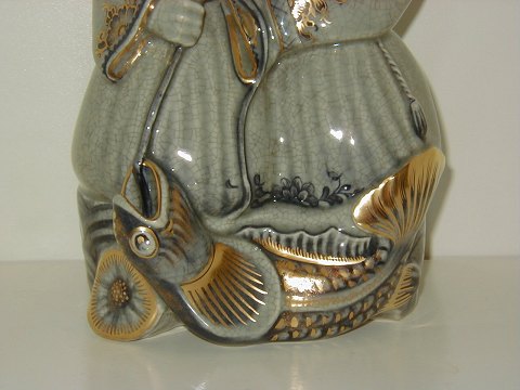 Sjælden & Stor Kongelig Figur i Grøn krakkeleret glasur af mand og kvinde med fisk. Typisk Georg Thylstrup design. Dek. nr. 1605, 1. sortering, måler 22 x 15 cm.