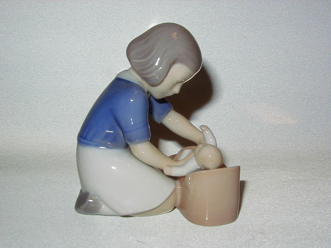 Sjælden Bing & Grøndahl Figur, Pige med Dukke i Kurv. Dekorationsnummer 2307 2. sortering Højde 11 cm.