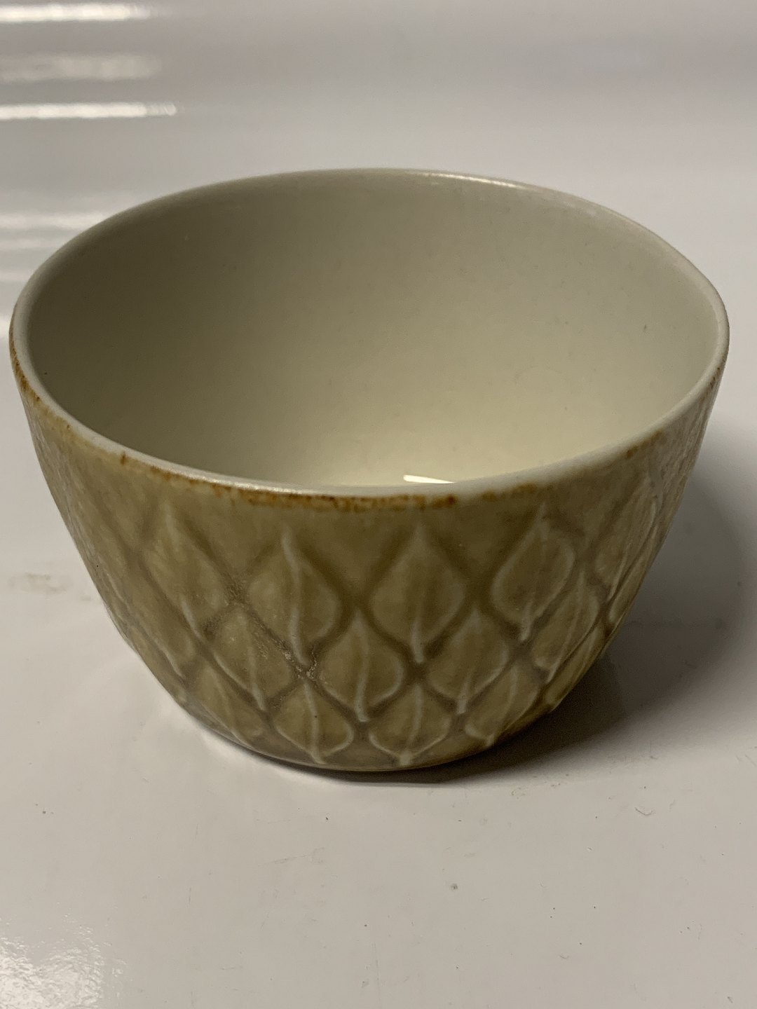 Relief Nissen Kronjyden stentøjsstel service skål Bladformet mønster Mål Diameter 8 cm Højde 5 cm Pæn og velholdt Se i øvrigt vores store udvalg af kaffe-spisestel her: https://www.antikhuset.net/katindex.asp?kukat=553