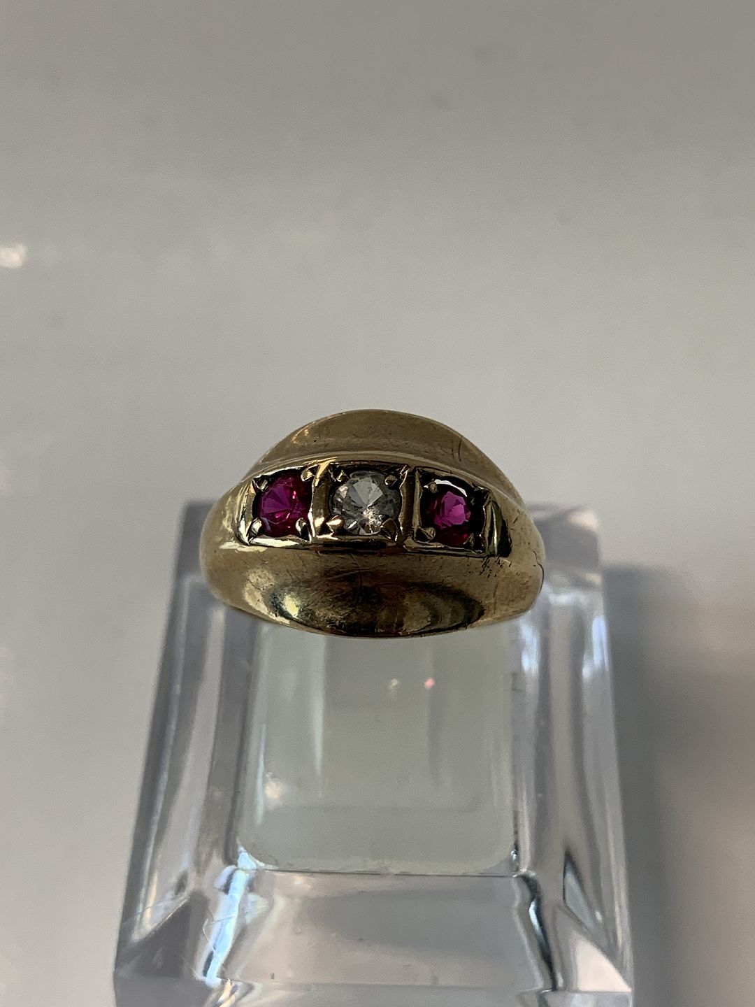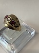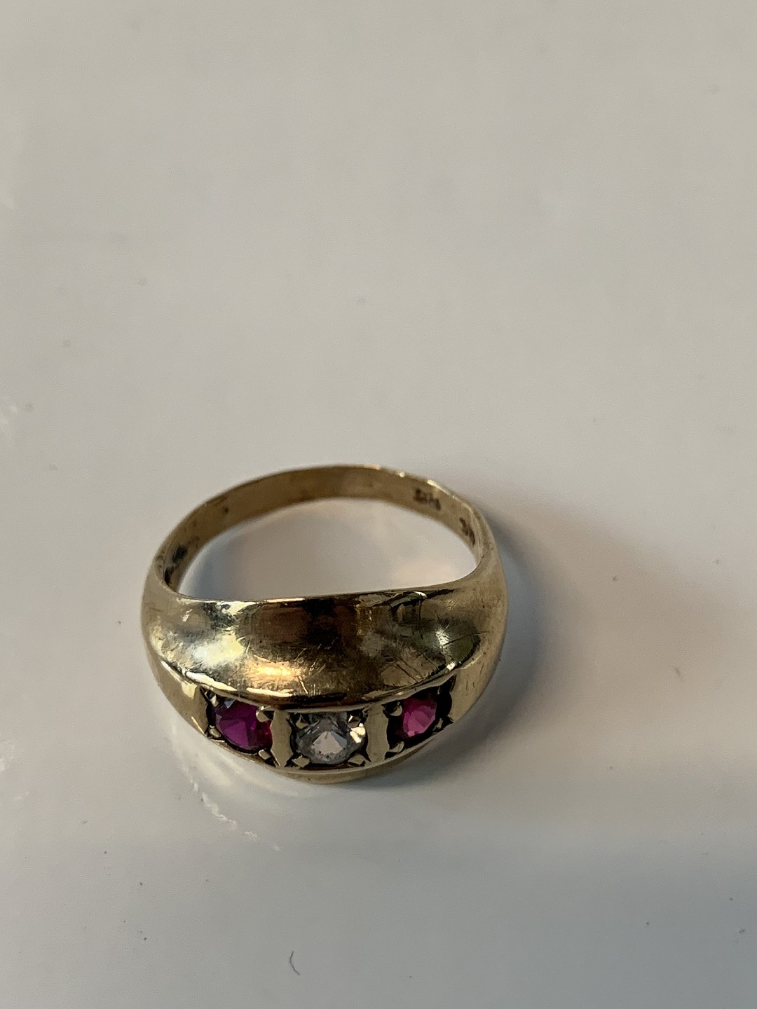 Damering med 2 røde og 1 klar sten, i 8 Karat guld.