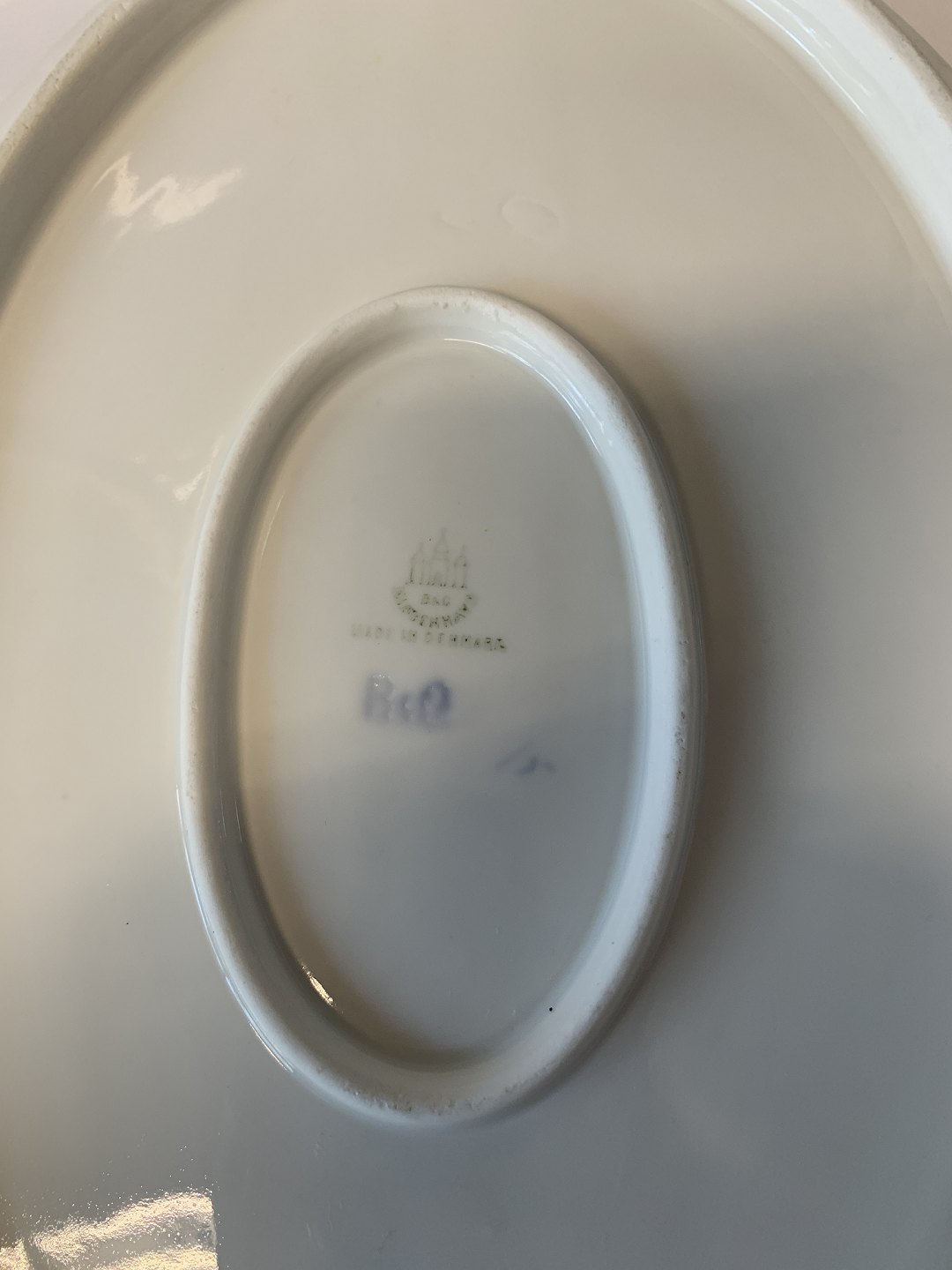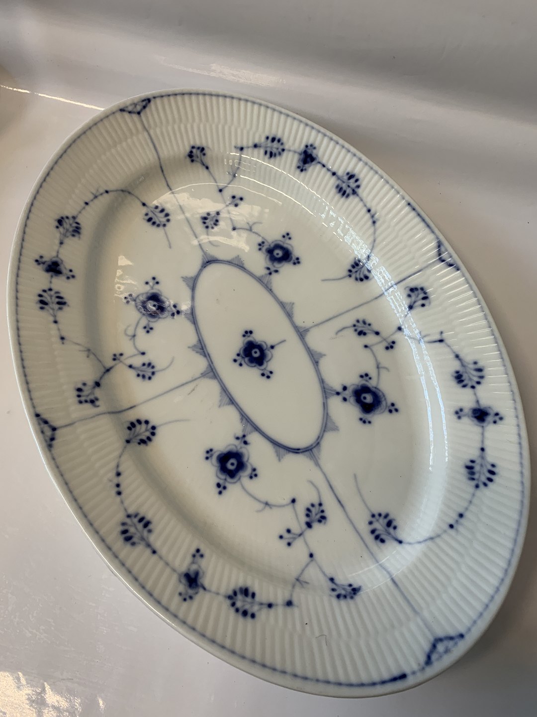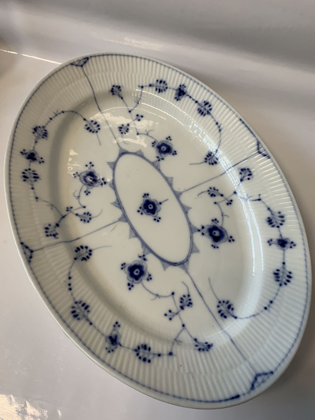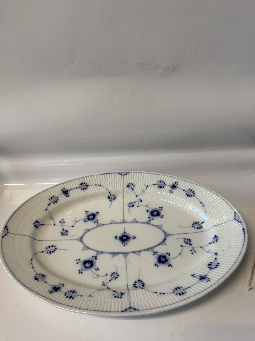 Bing og Grøndahl, Ovalt fad Blåmalet Musselmalet Riflet. Fabriksmærket viser, at fadet er produceret mellem. 1902-1914. Længde 39 cm. Bredde 27,5 cm. 1. sortering. Pæn og velholdt stand.