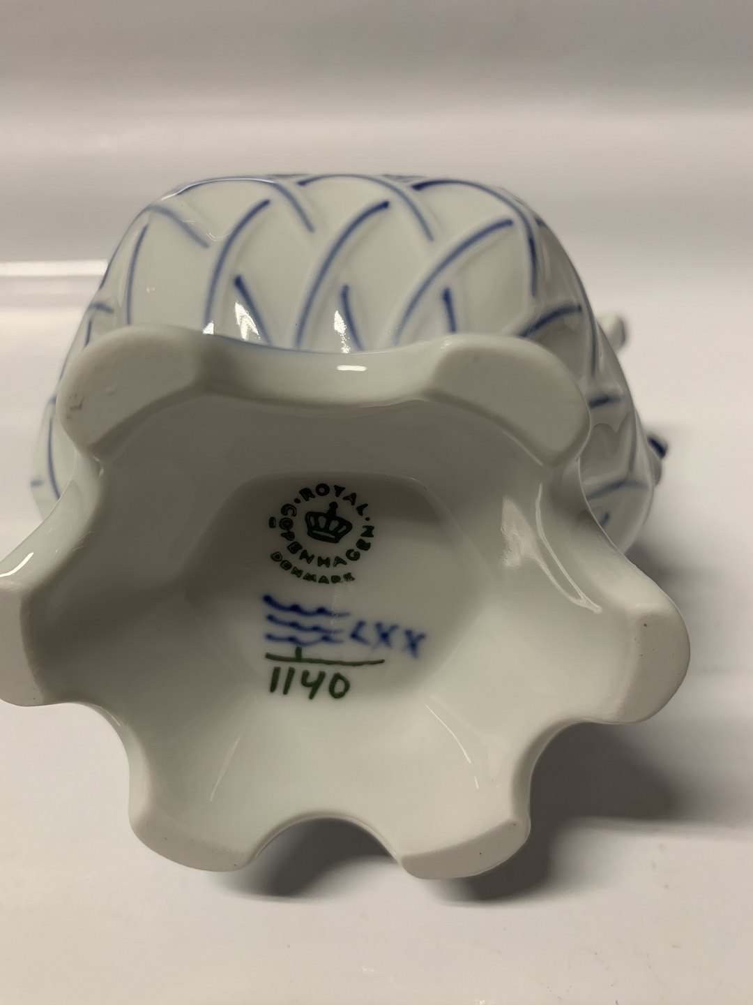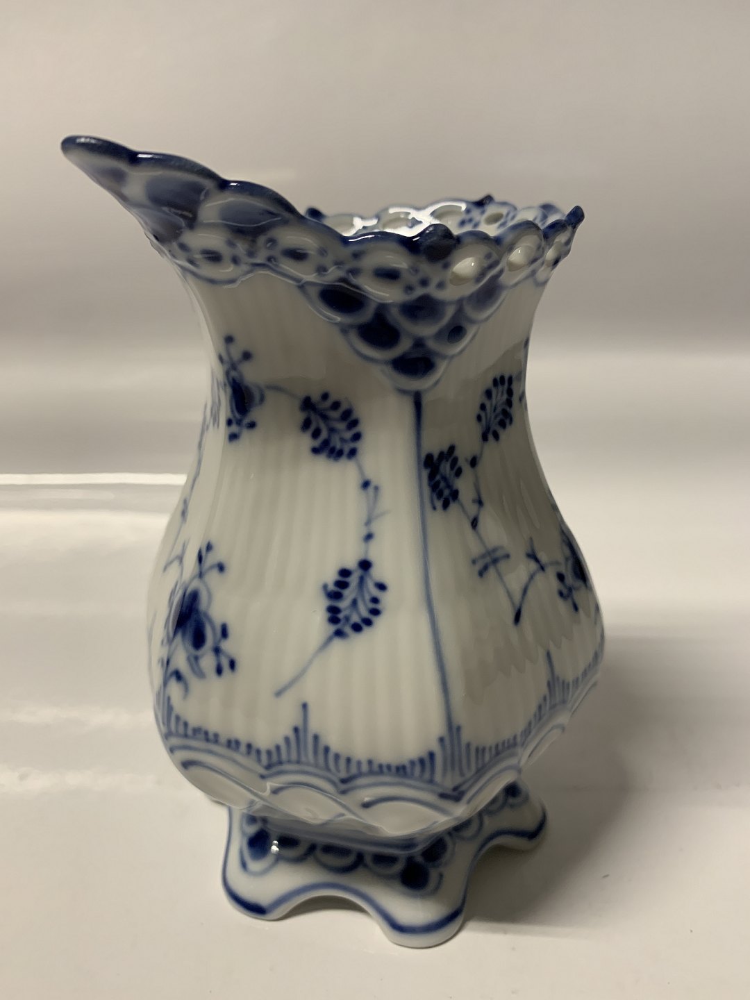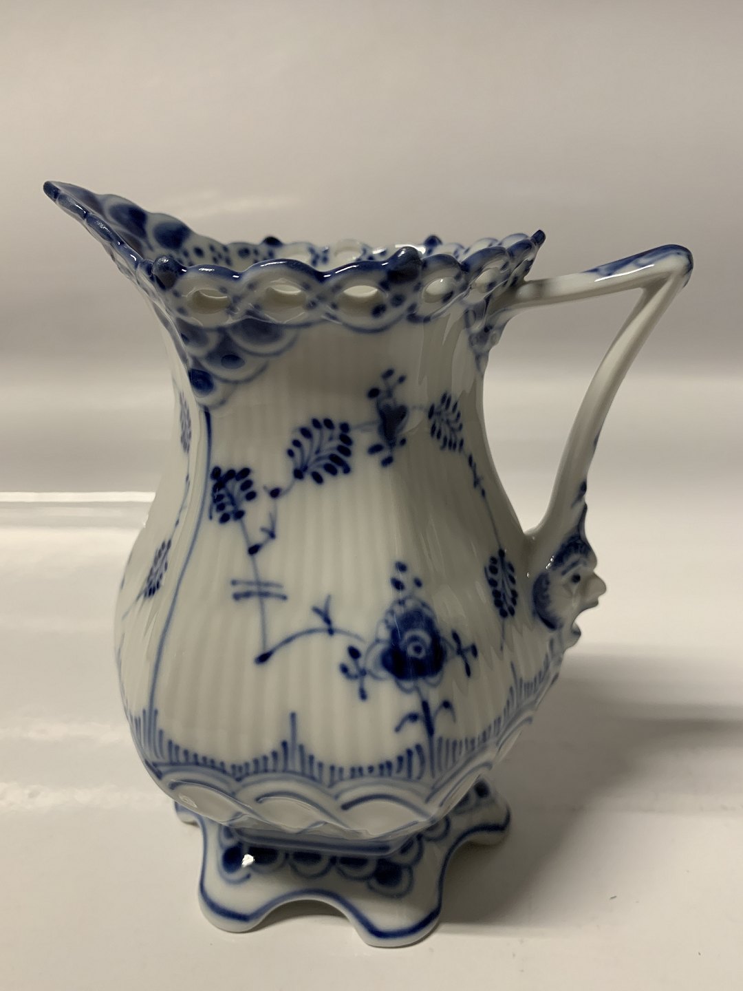 Royal Copenhagen Musselmalet Helblonde, ekstra stor flødekande. Af fabriksmærket ses det, at denne er produceret i 1963. Dekorationsnummer 1/1140. 2. sortering. Højde 12,6 cm. Perfekt stand.