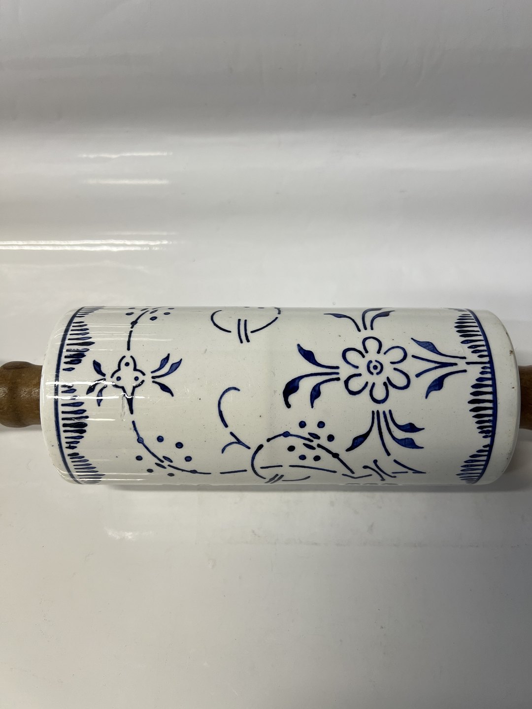 Kagerulle Musselmalet fajance med træ hank.