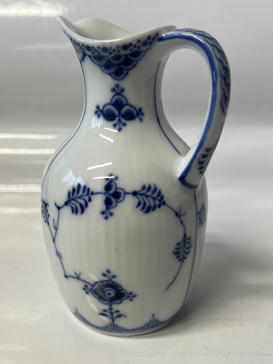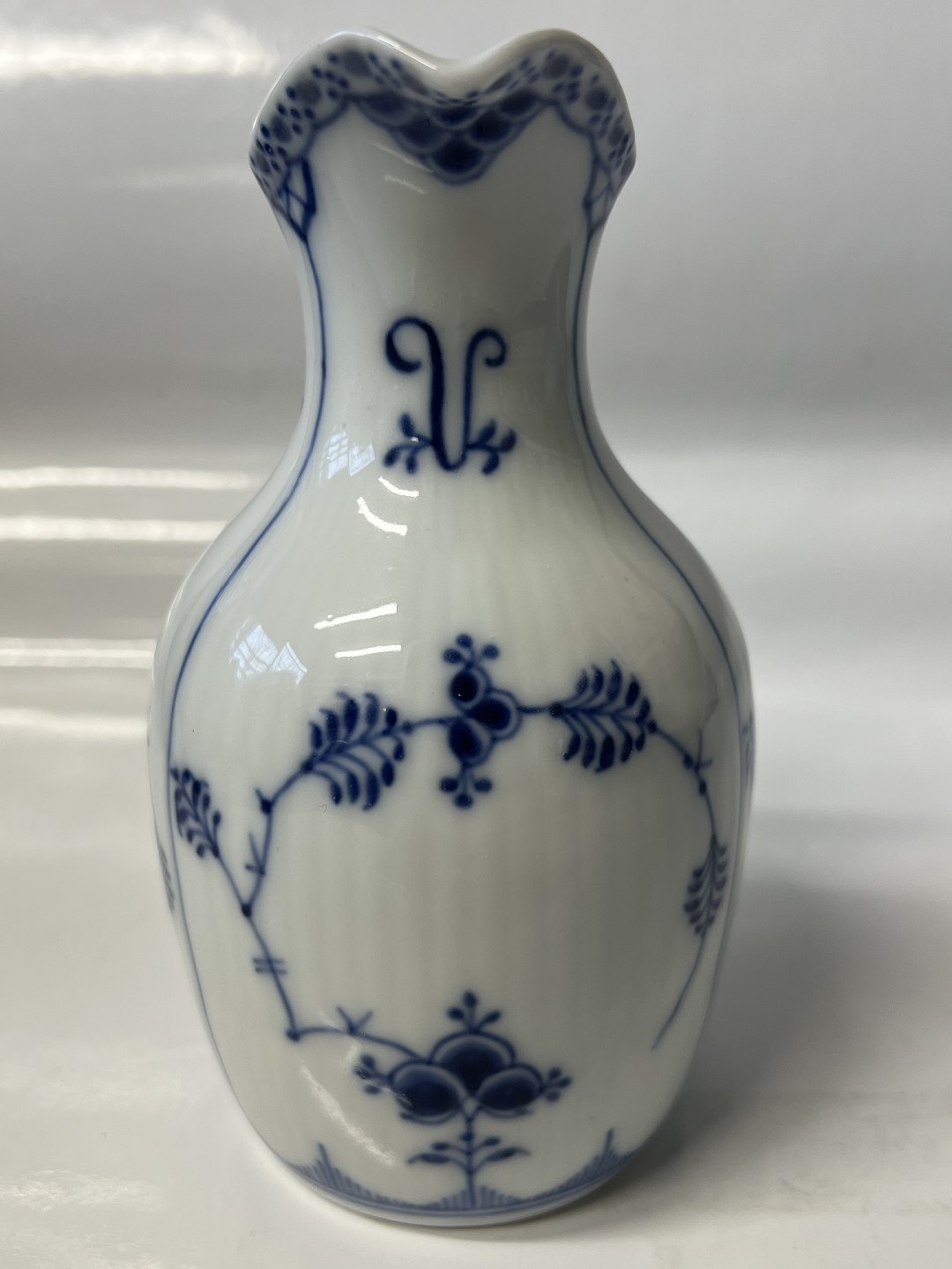Royal Copenhagen Musselmalet Helblonde, eddikeflaske uden prop. Af fabriksmærket kan det udledes, at denne er produceret mellem 1898 og 1923. Dekorationsnummer 1/1180. 1. sortering. Højde 13,5 cm. Perfekt stand uden fejl.