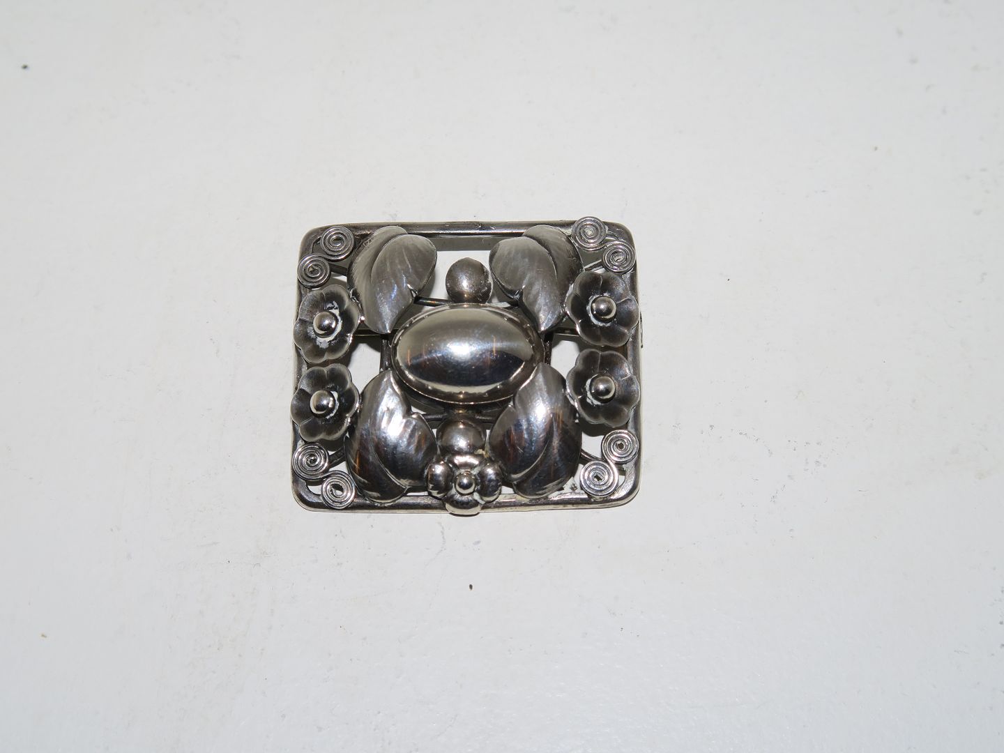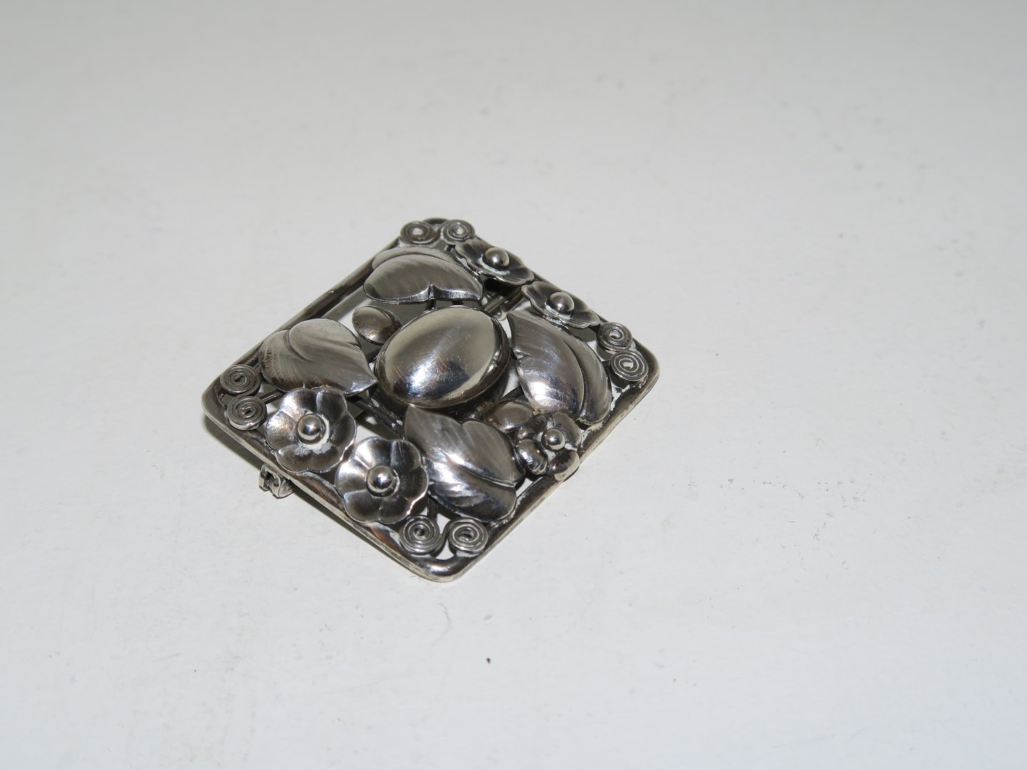 Firkantet sølv broche med blomster og blade fra ca. 1950-1960