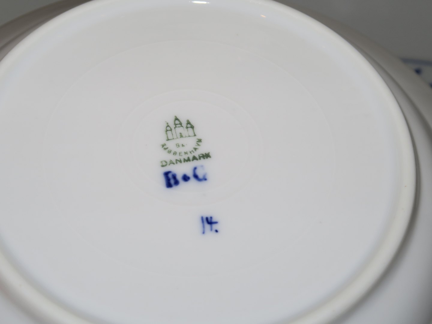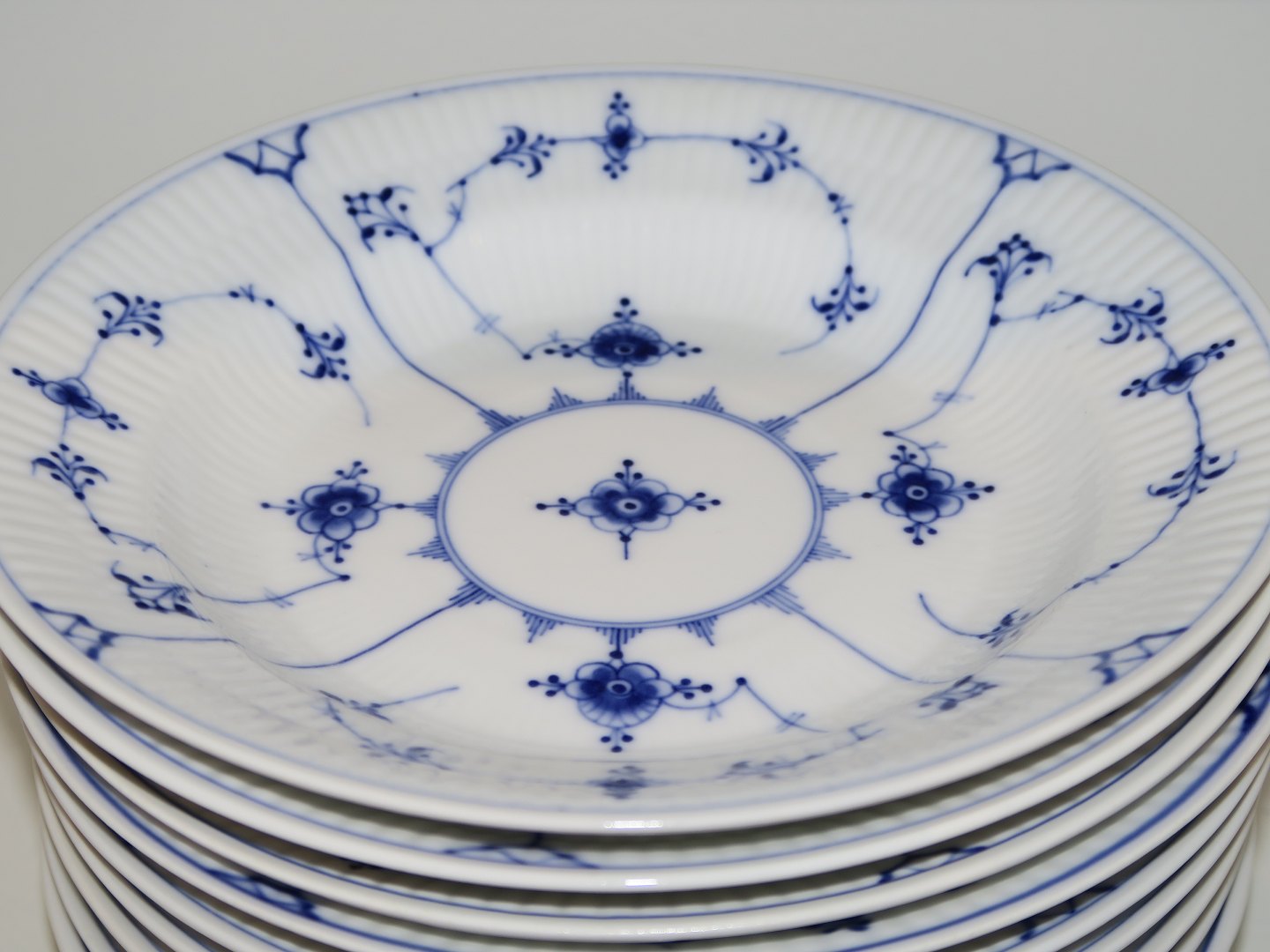 Bing & Grøndahl Blåmalet Riflet (Musselmalet Riflet), lille dyb tallerken. Af fabriksmærket ses det, at disse er produceret mellem 1915 og 1948. 1. sortering. Diameter 21,0 cm. Perfekt stand uden fejl.