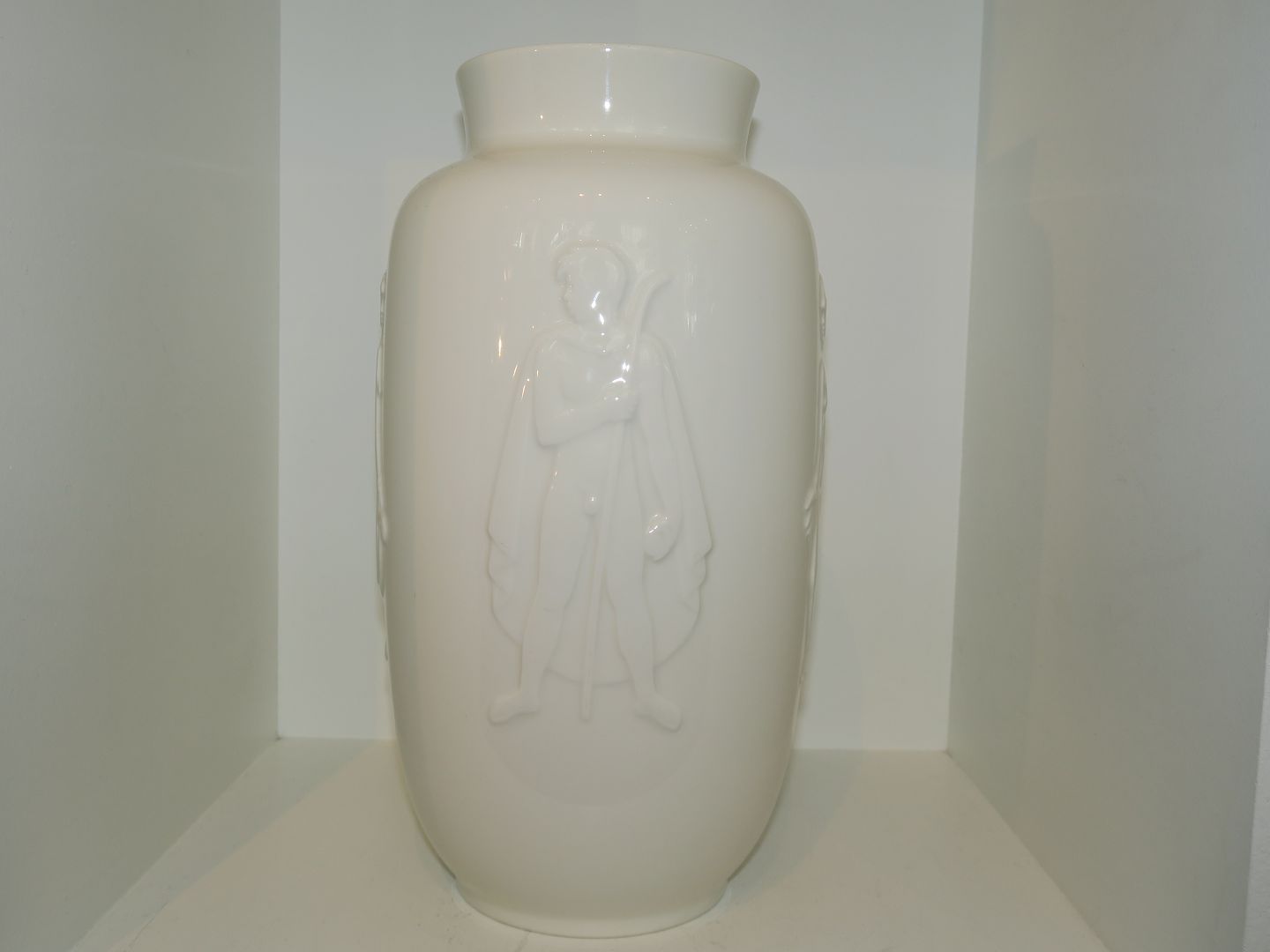 Stor hvid vase med fire menneske dekorationer fra 1956