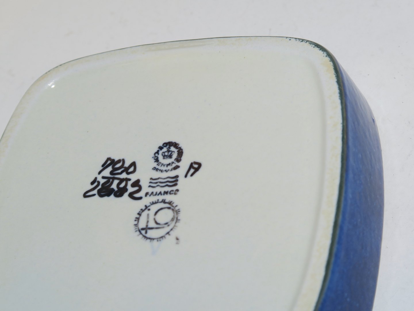 Royal Copenhagen Baca, lille blå firkantet skål. Designet af Johanne Gerber. Dekorationsnummer 780/2882. 1. sortering. Måler 11,0 x 10,8 cm. Perfekt stand uden fejl.