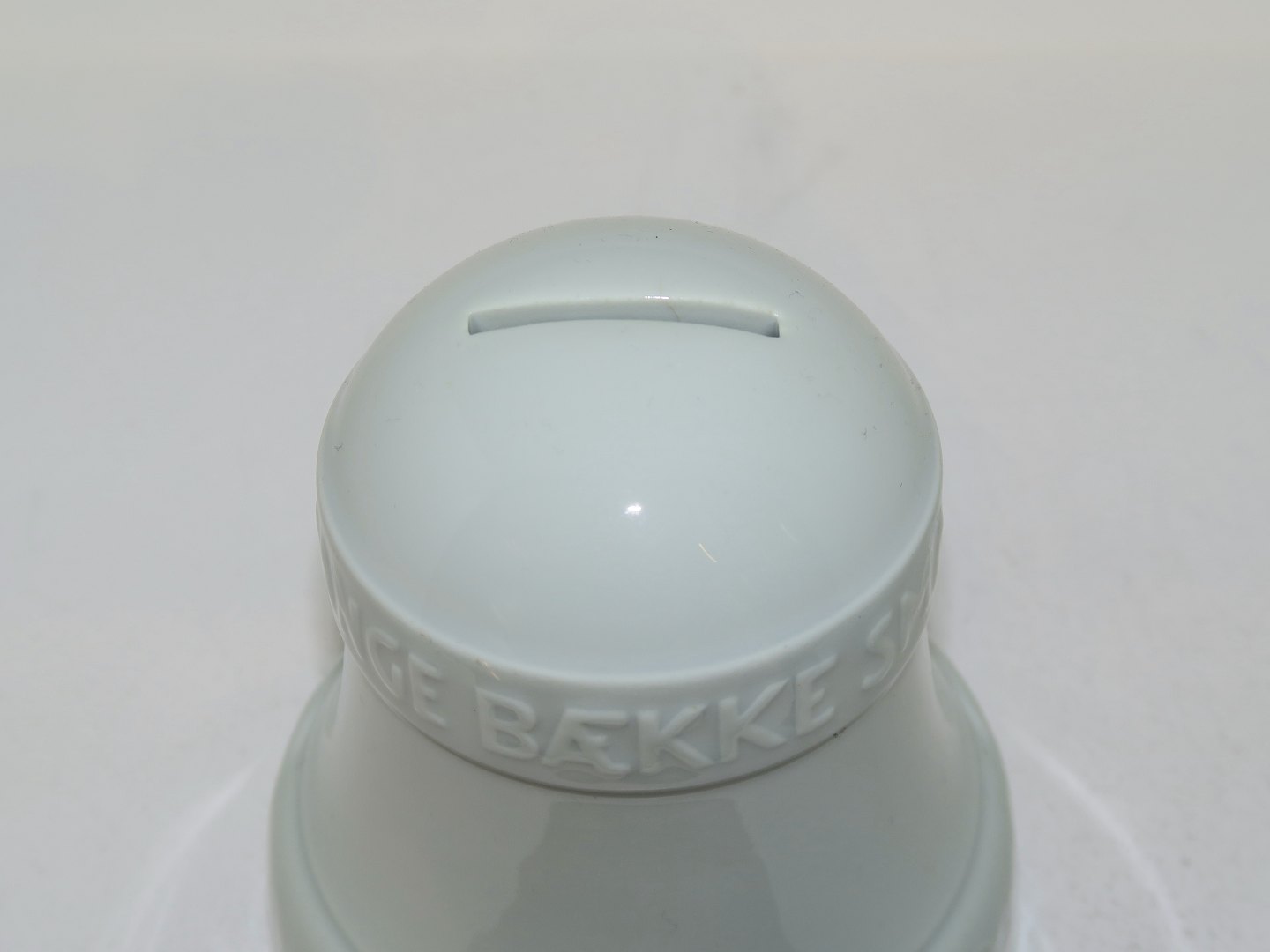 Bing & Grøndahl grøn sparrebøsse. Af fabriksmærket ses det, at denne er produceret mellem 1962 og 1970. 1. sortering. Højde 12,0 cm., diameter på bunden 10,5 cm. Låsepladen mangler ellers perfekt stand uden fejl.