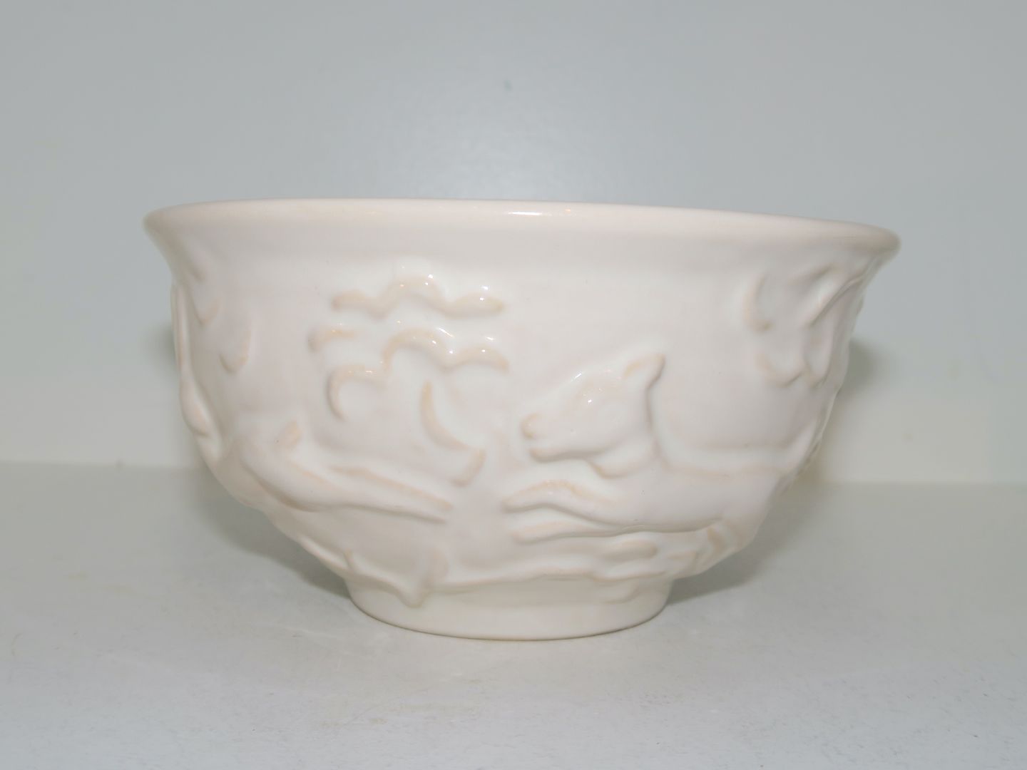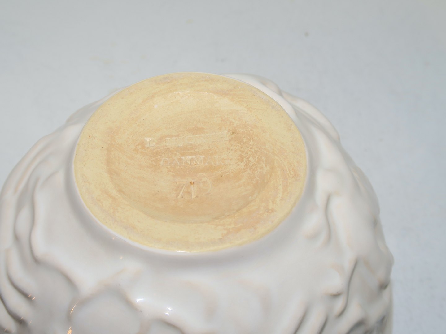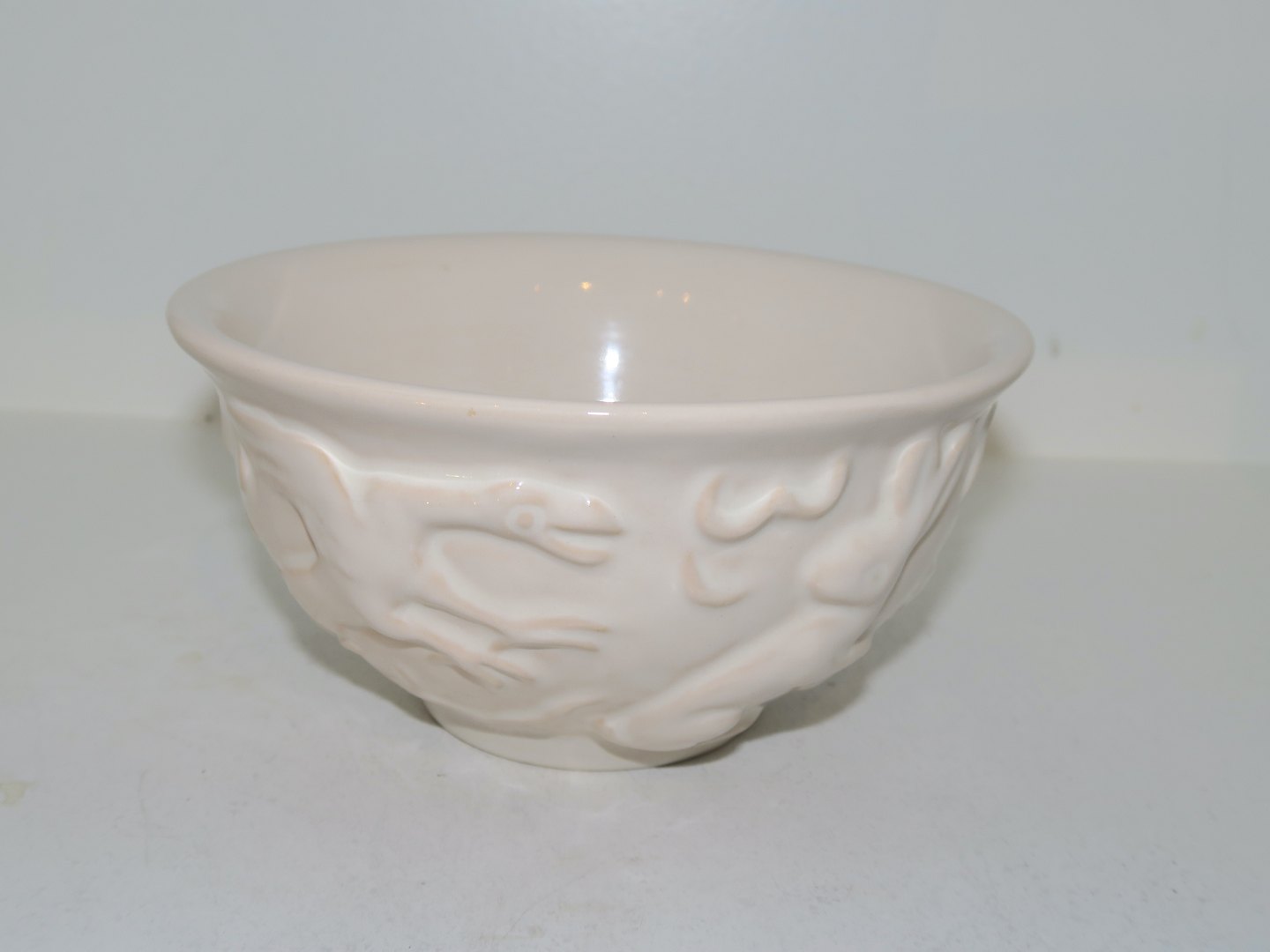 Hjorth keramik fra Bornholm, krukke med fugle og kaniner. Dekorationsnummer 719. Diameter 13.2 cm., højde 6,8 cm. Perfekt stand uden fejl.