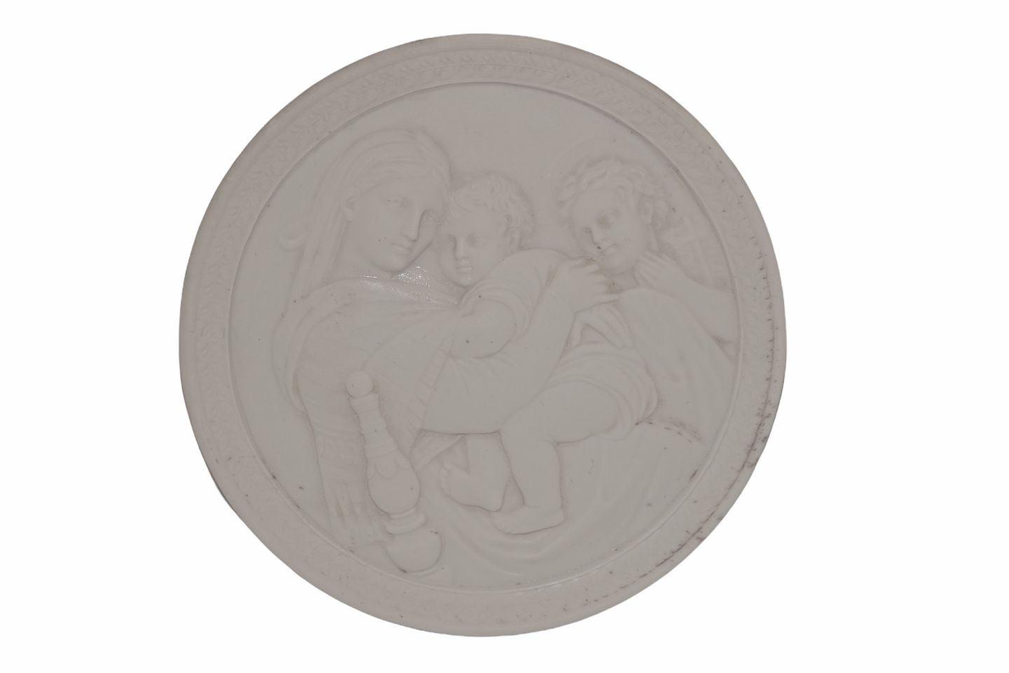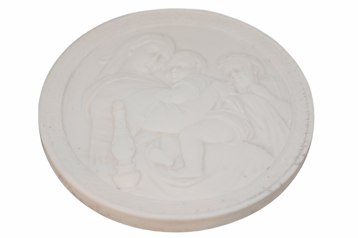 Royal Copenhagen biscuit sjælden lille platte med motiv af moder med to børn. Denne er fra ca. 1840-1890. Diameter 10,3 cm. 1. sortering. Der er lidt små mørke pletter på kanten ellers perfekt stand.