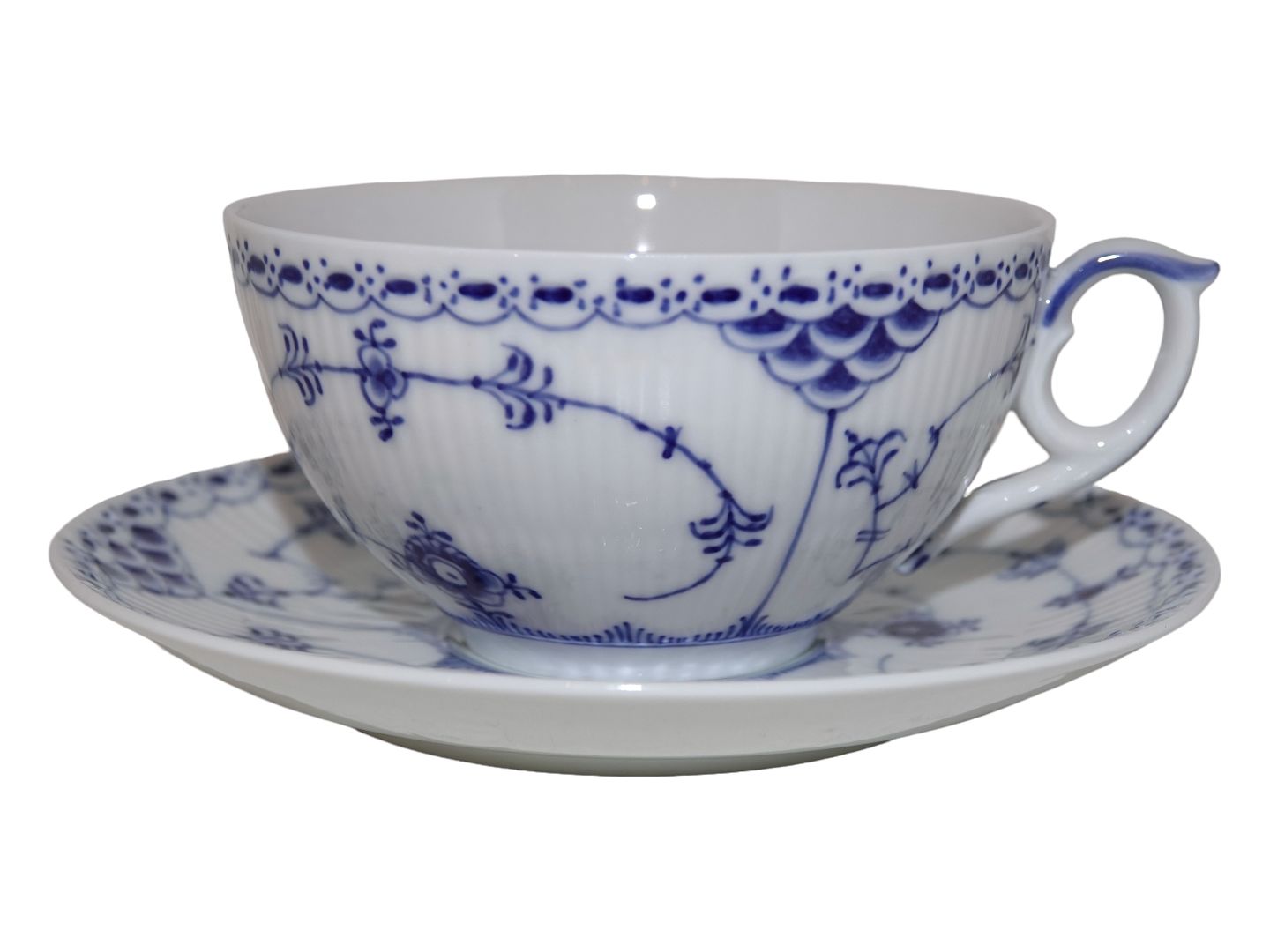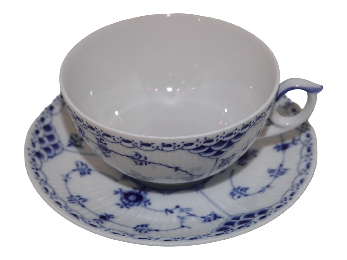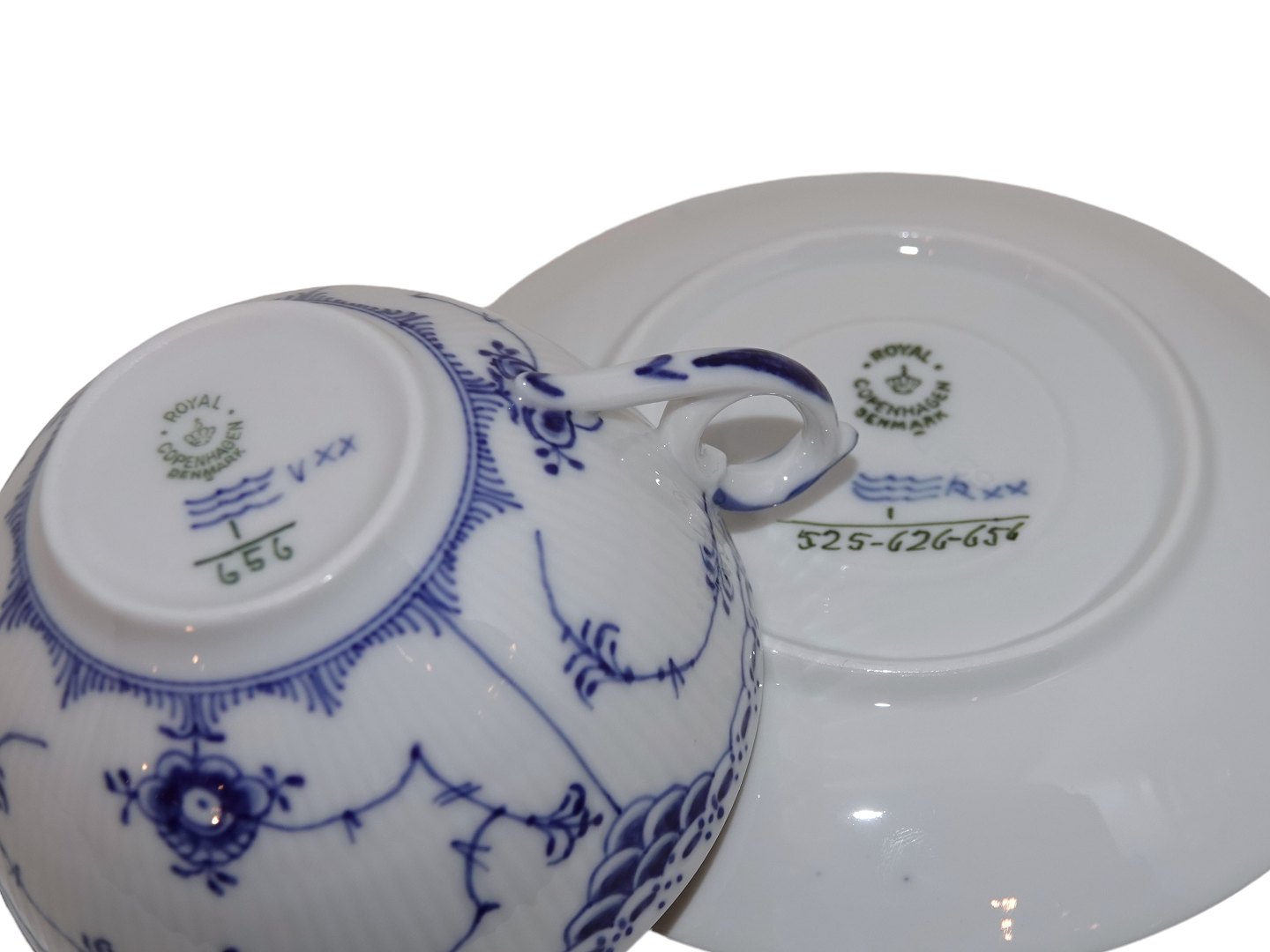 Royal Copenhagen Musselmalet Halvblonde, stor tekop med tilhørende underkop. Dekorationsnummer 1/656. 1. sortering. Koppen måler 10,5 cm. i diameter. Perfekt stand uden fejl.
