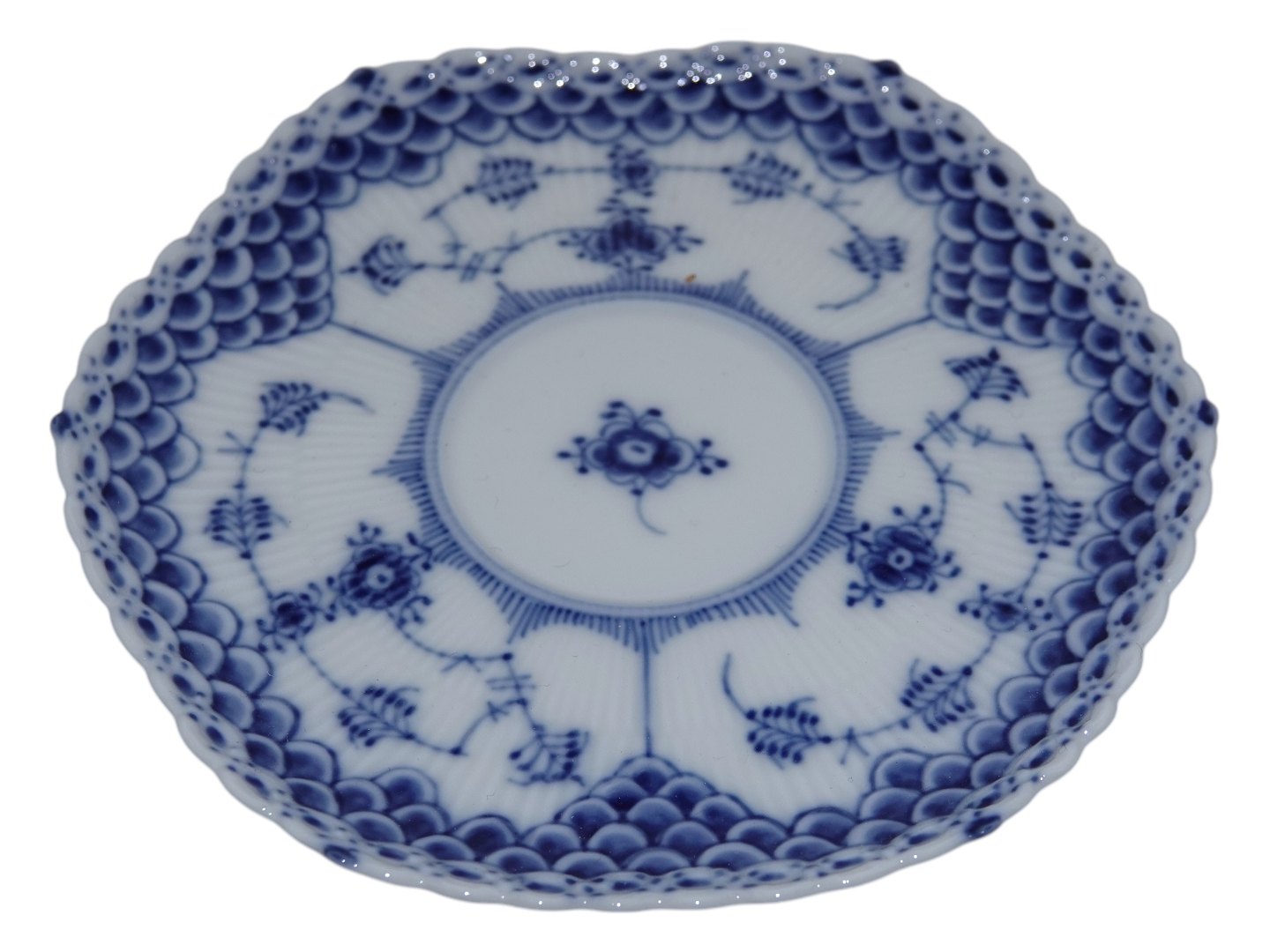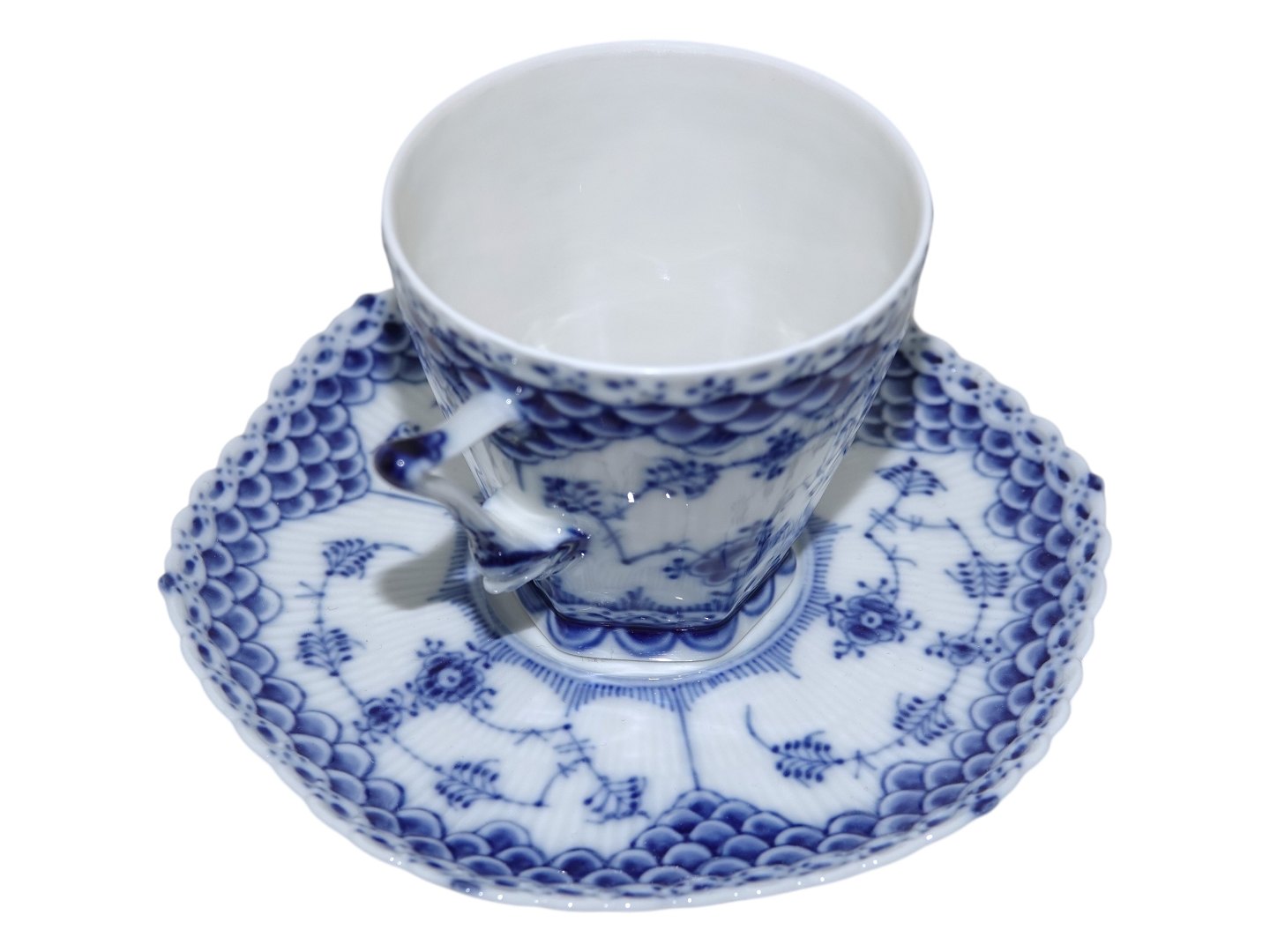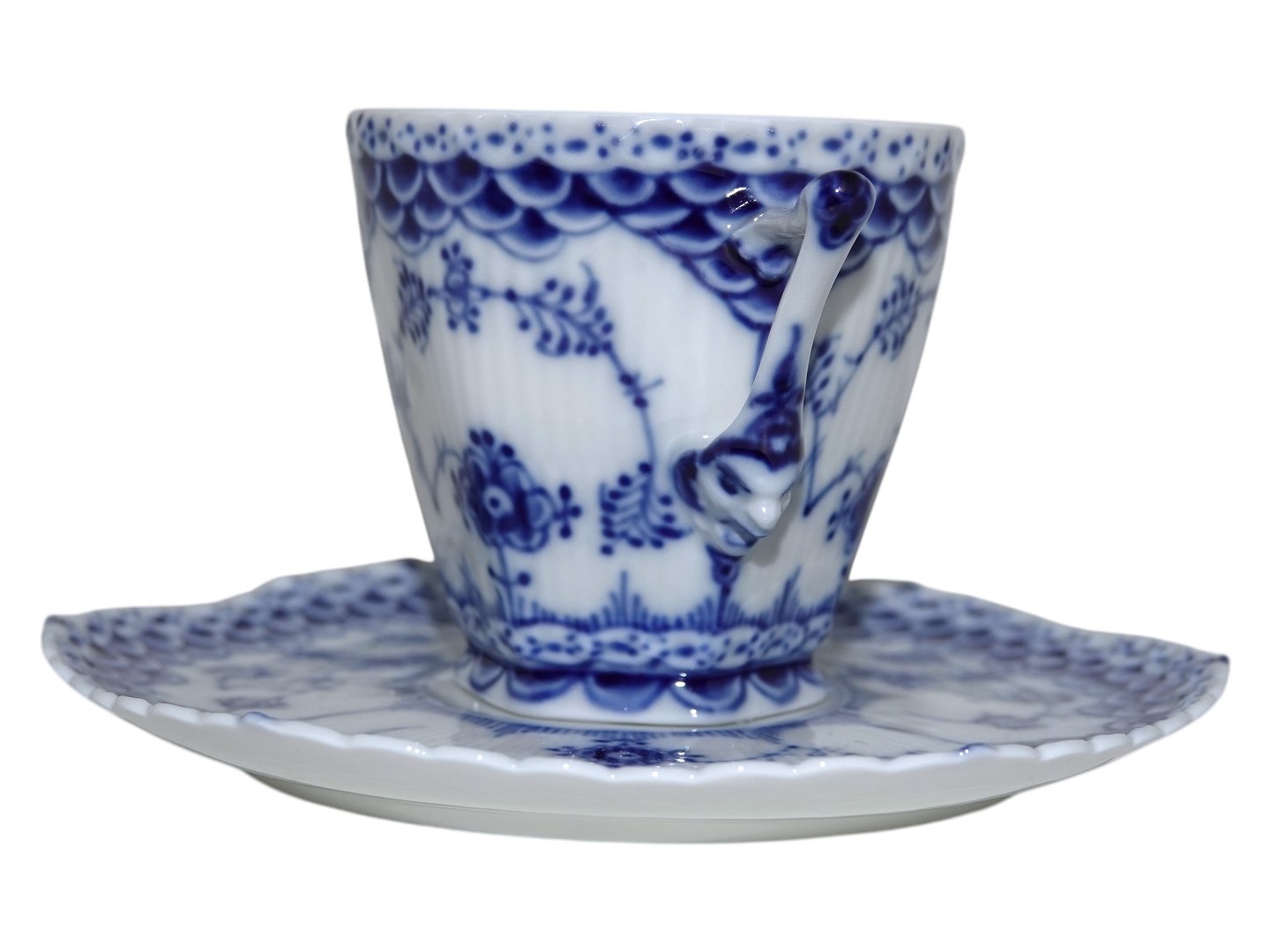 Royal Copenhagen Musselmalet Helblonde, kaffekop med djævelhoved på siden og med tilhørende underkop.
