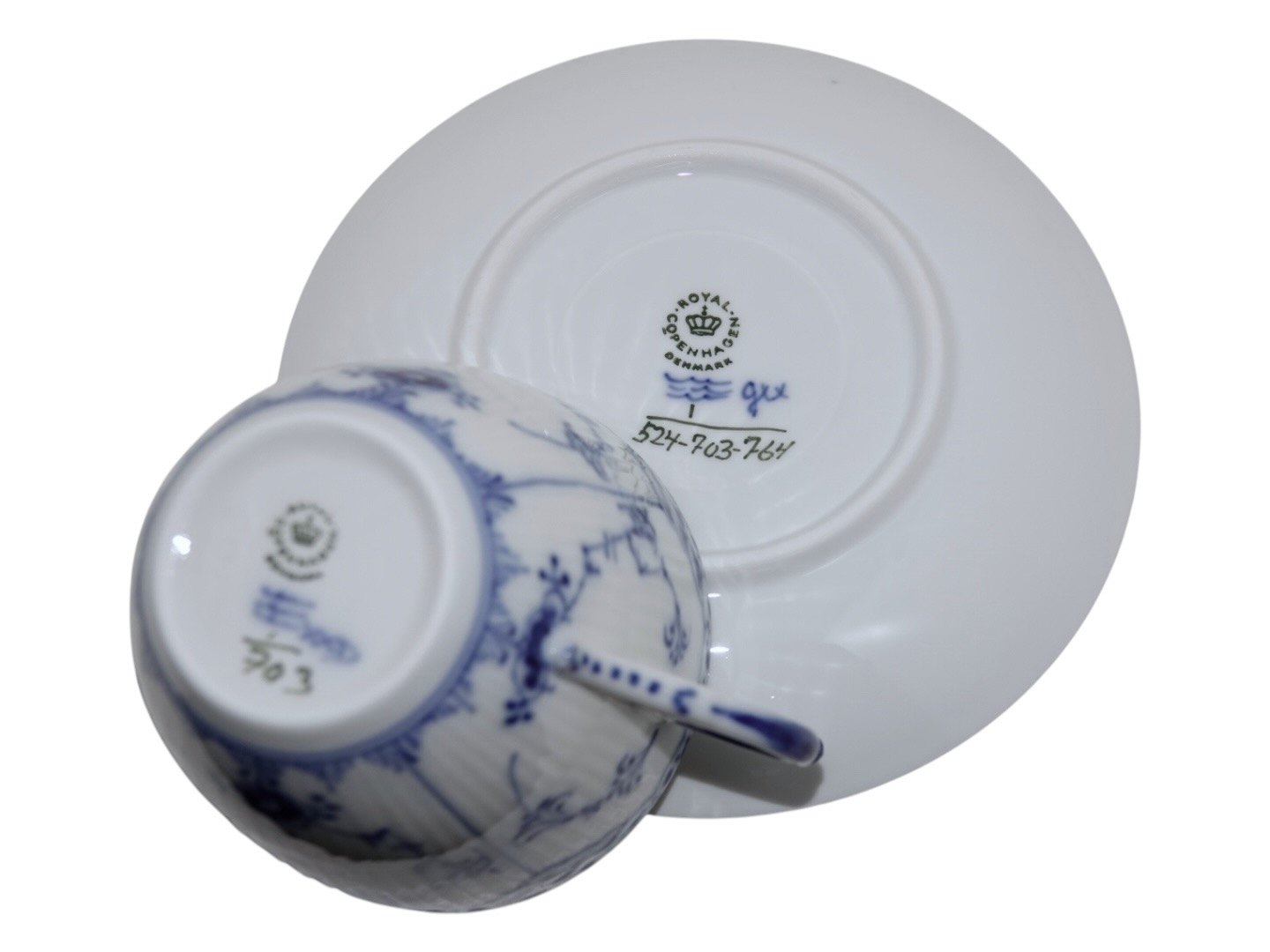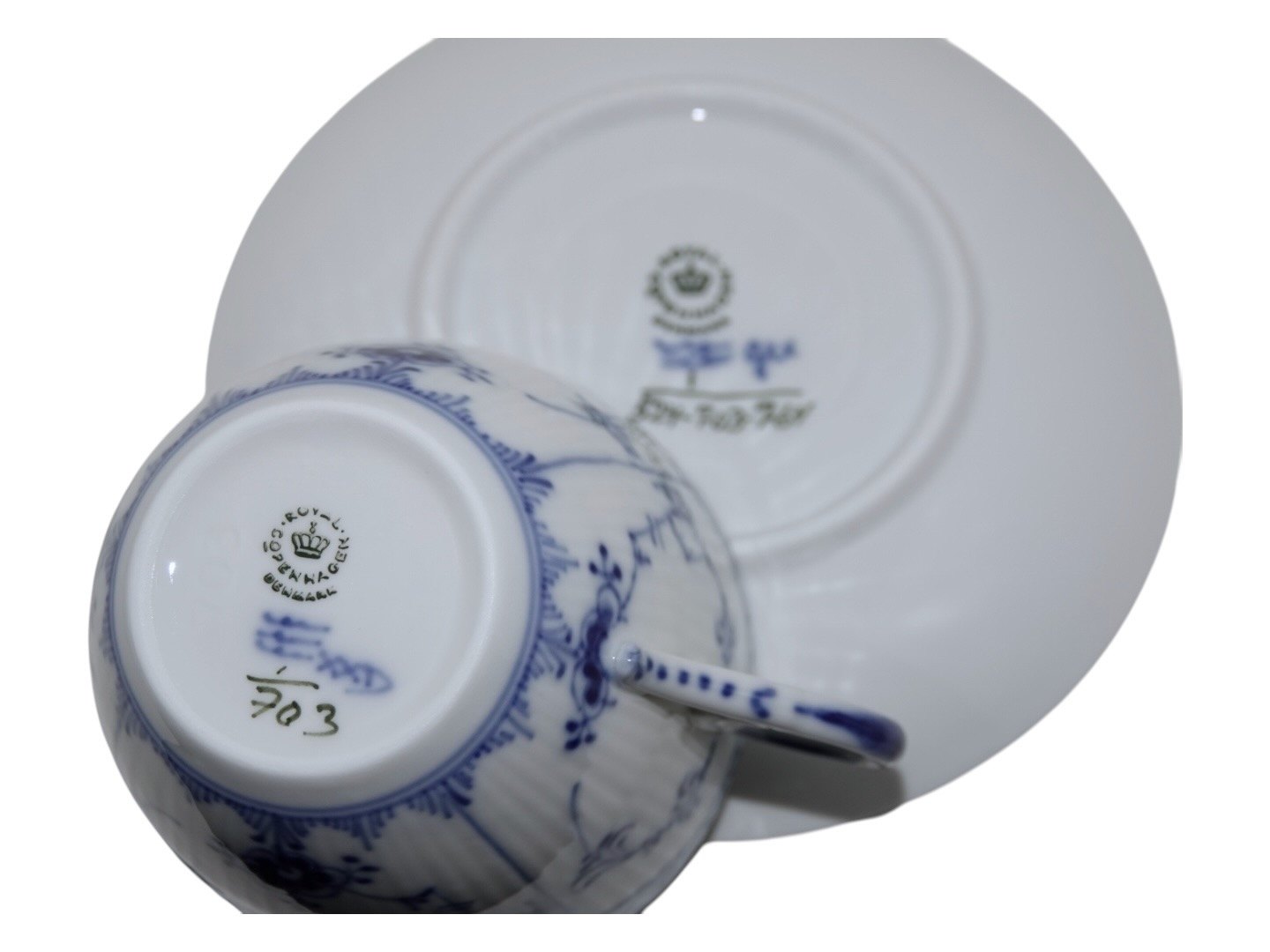 Royal Copenhagen Musselmalet Halvblonde, kæmpe kontorkop. Dekorationsnummer 1/703. 1. sortering. Koppen måler imponerende 9,5 cm. i diameter og 8,0 cm. i højden. Perfekt stand uden fejl.