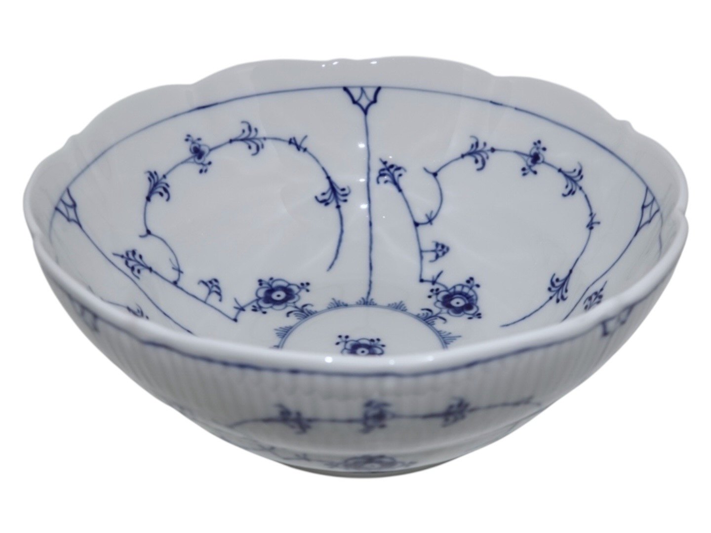 Royal Copenhagen Musselmalet Riflet, rund skål med bølget kant.