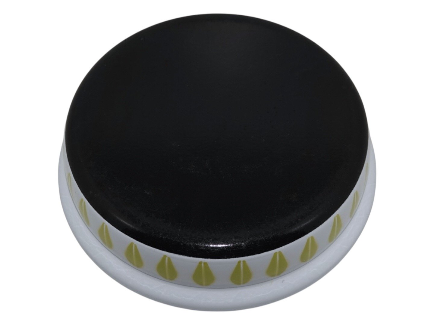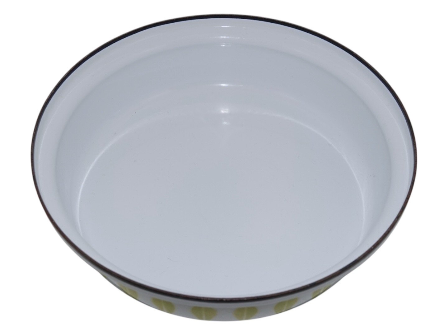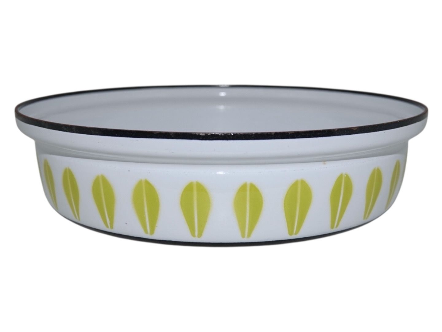 Lotus emalje skål med limegrøn dekoration fra Cathrineholm i Norge. Det har oprindeligt været en sauterpande, denne er blot uden låg og hank.