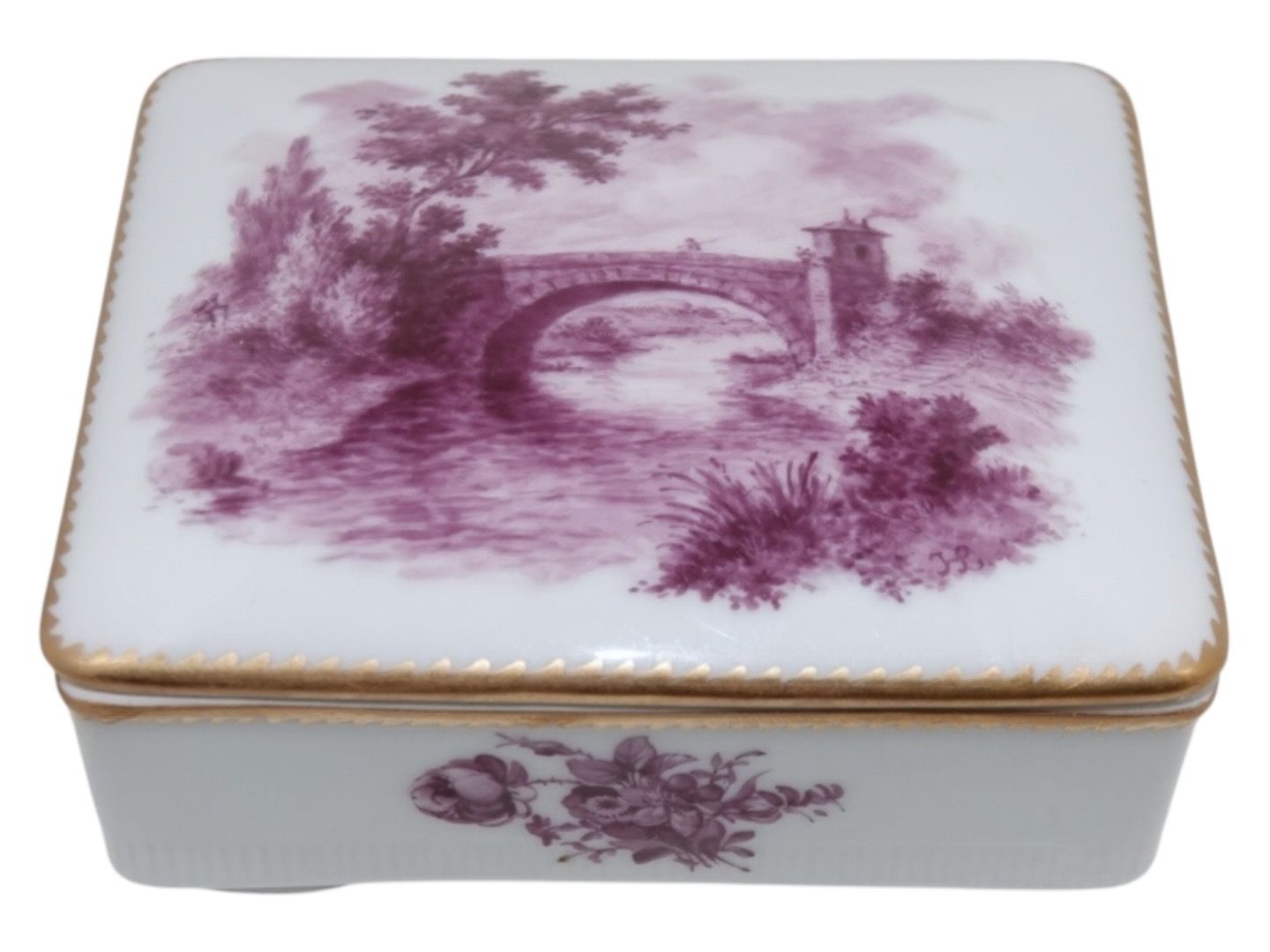 Pirkenhammer porcelæn fra Bøhmen / Tjekkoslovakiet, lågæske med purpur dekoration. Måler 11 x 9 cm. Perfekt stand.