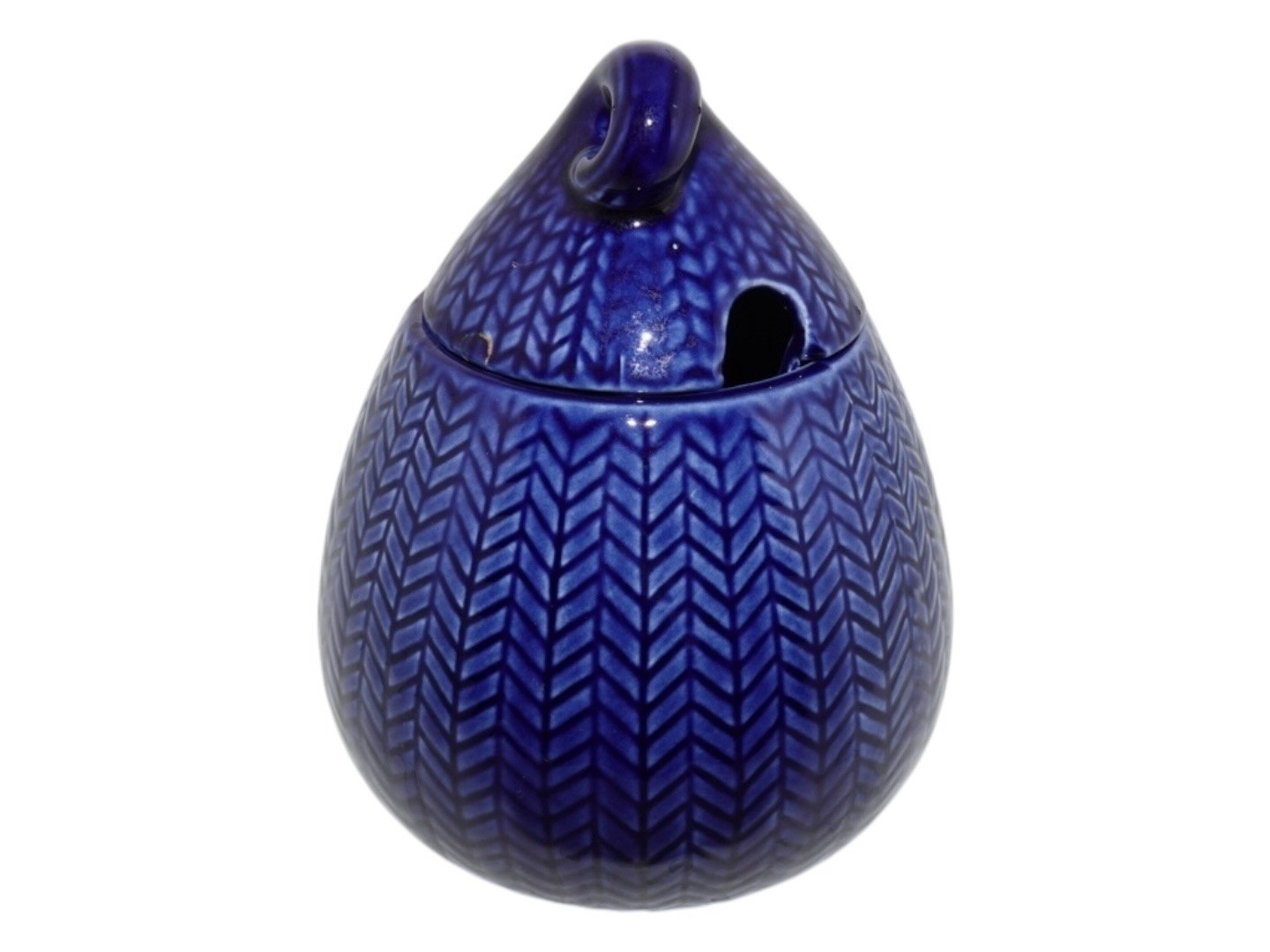 Rörstrand (Rørstrand) Blå Ild (Blå Eld), marmeladekrukke. Designet af Hertha Bengtsson og stellet er produceret fra 1950 til 1971. Højde 12,5 cm. På låget er der et pålimet skår, se nærfoto, ellers fin stand.