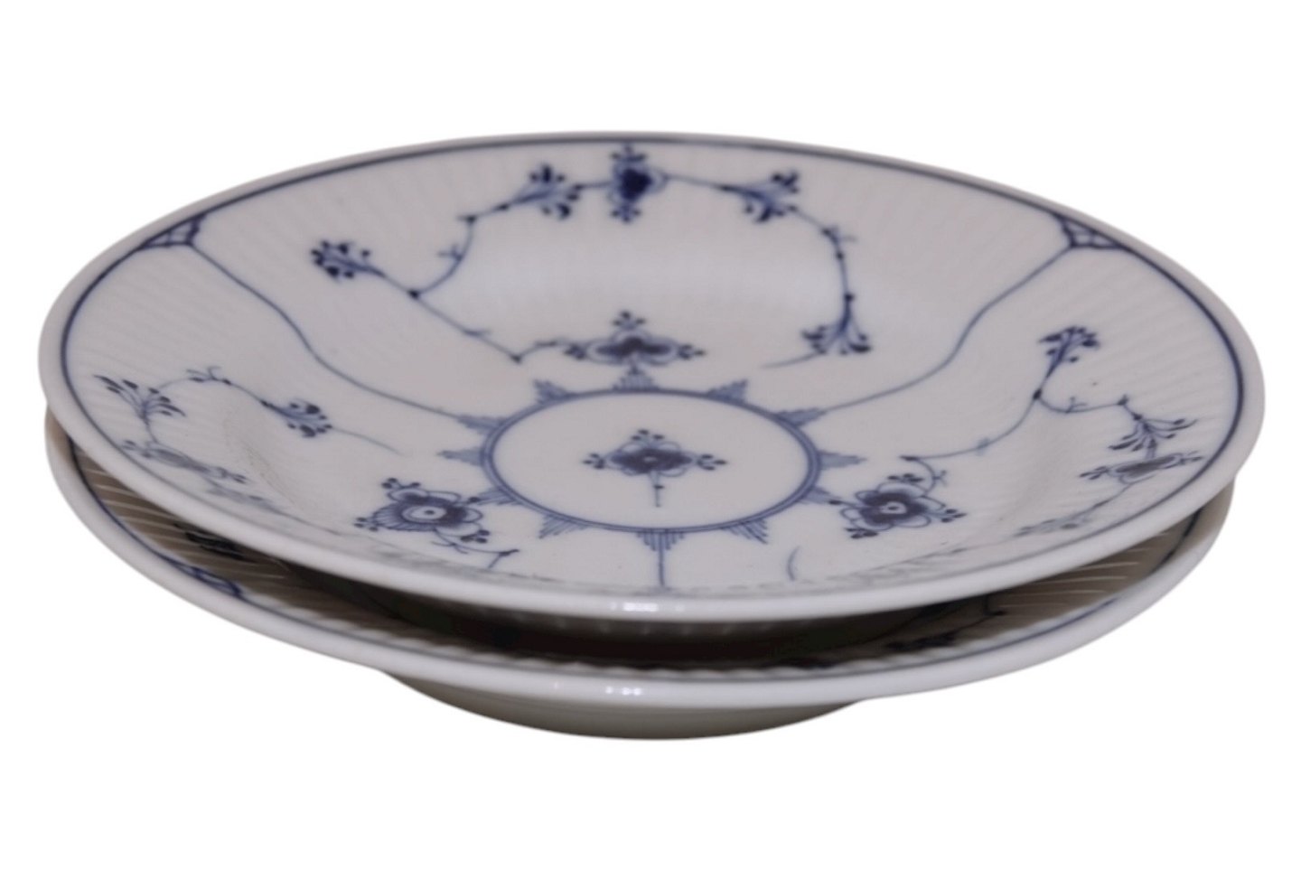 Bing & Grøndahl Blåmalet Riflet (Musselmalet Riflet), lille brødtallerken. Af fabriksmærket ses det, at disse er produceret mellem 1895 og 1898. 1. sortering. Diameter 13,7 cm. Perfekt stand uden fejl.