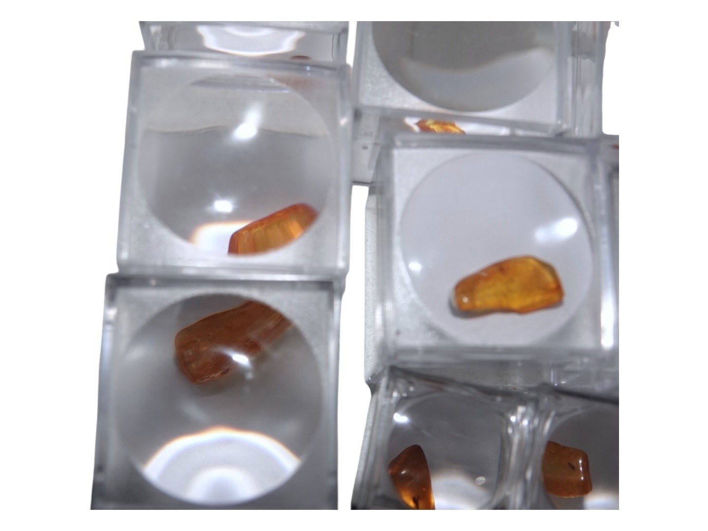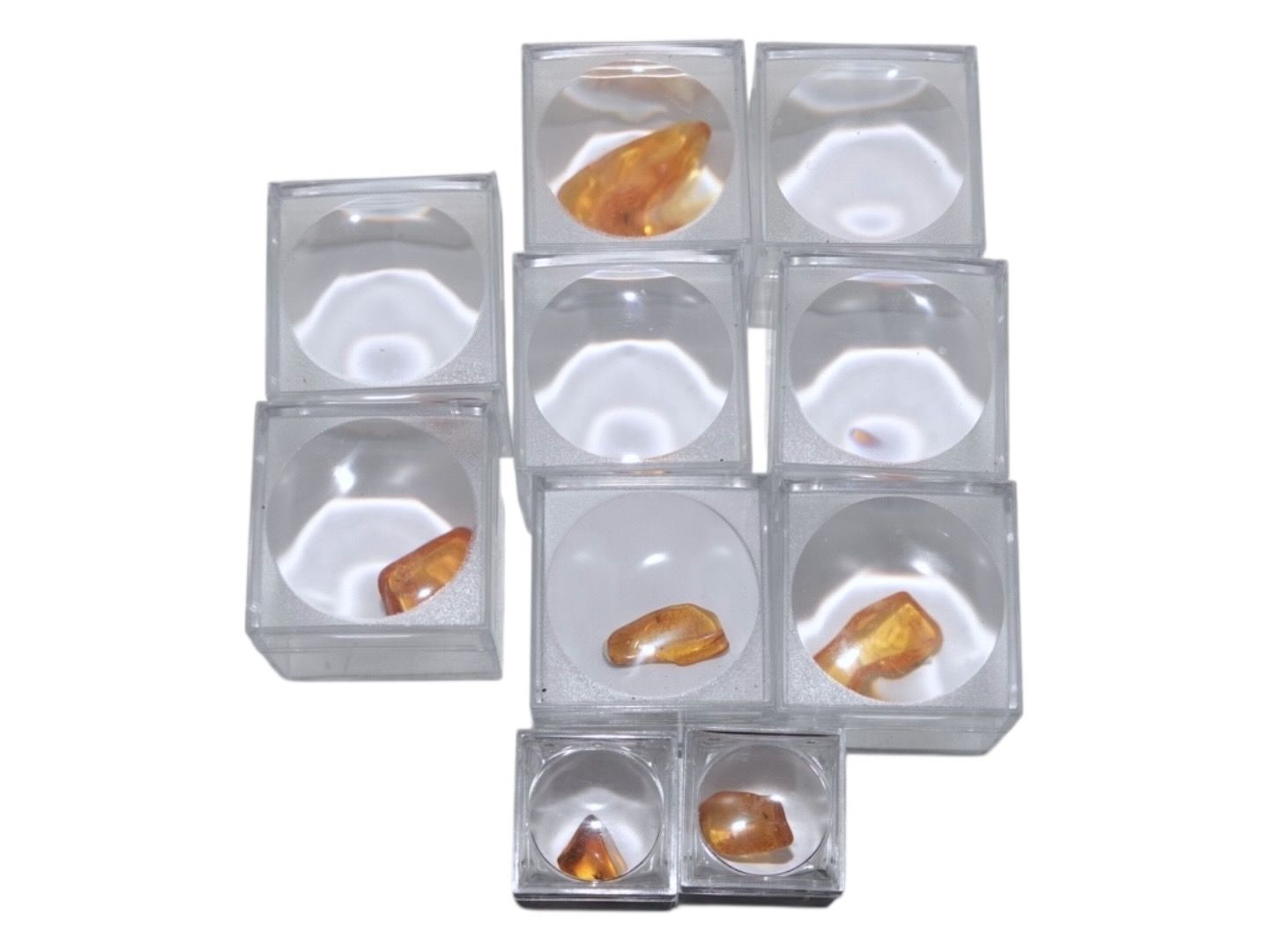 Samling på 10 stykker rav alle med insekter inden i. Ravstykkerne er poleret og hver ligger i en plastæske med forstørrelseseffekt. De måler hver ca. 1,5 - 2,0 cm. Fin stand. Prisen er for alle 10 stykker til sammen.
