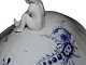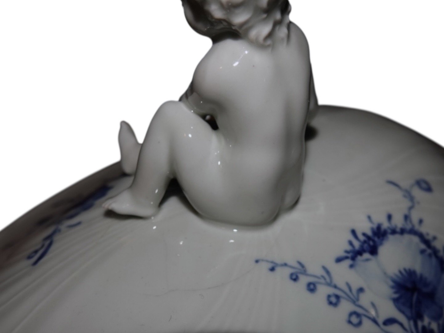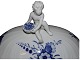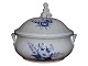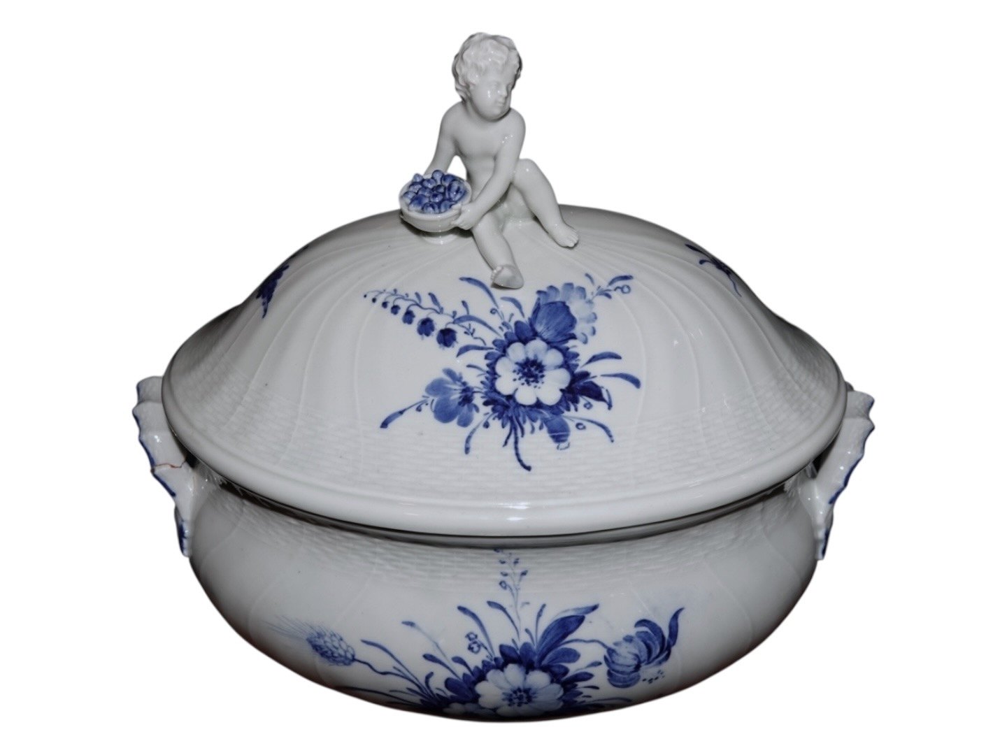 Royal Copenhagen Blå Blomst Svejfet, ekstra stor suppeterrin med låg med figur af dreng (putto). Det er en tidlig udgave, hvor porcelænet er gråt fremfor hvidt.