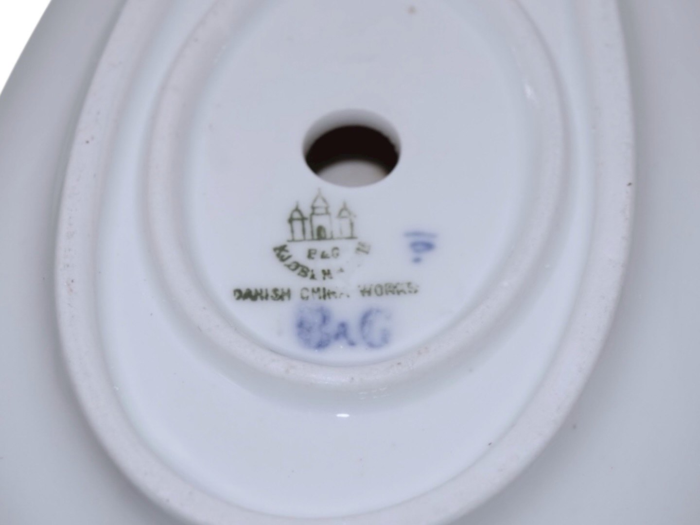 Bing & Grøndahl Blåmalet (Musselmalet), sjælden sovseskål. Af fabriksmærket ses det, at denne er produceret mellem 1899 og 1902. 1. sortering. Længde 21,0 cm. Perfekt stand uden fejl.