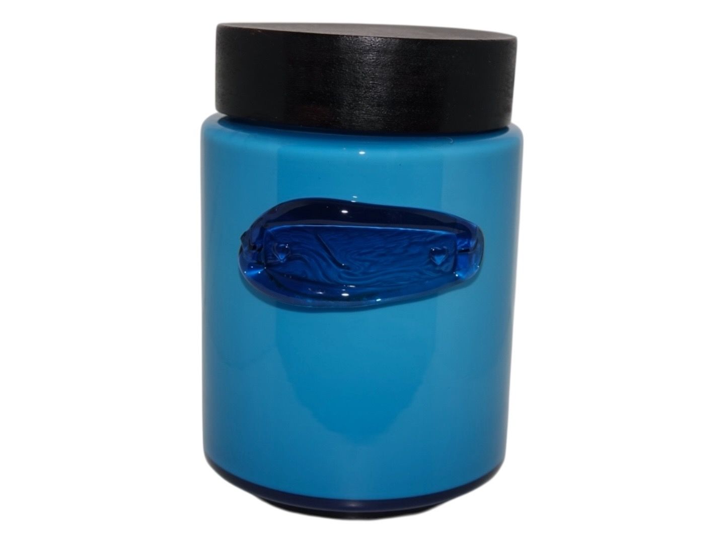 Holmegaard Palet, blå opbevaringskrukke med trælåg uden tekst. Designet af Michael Bang i 1970. Højde 14,3 cm. Perfekt stand uden fejl.