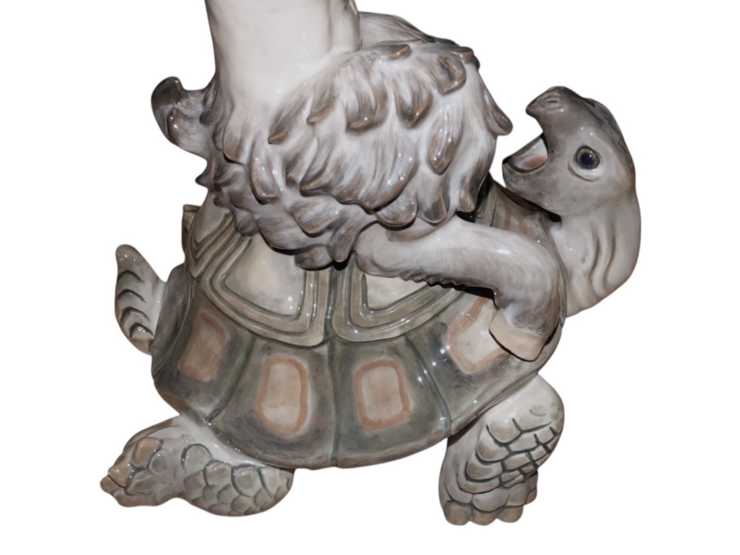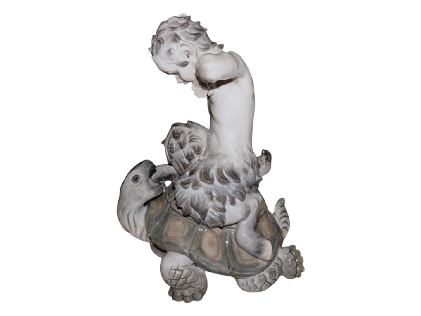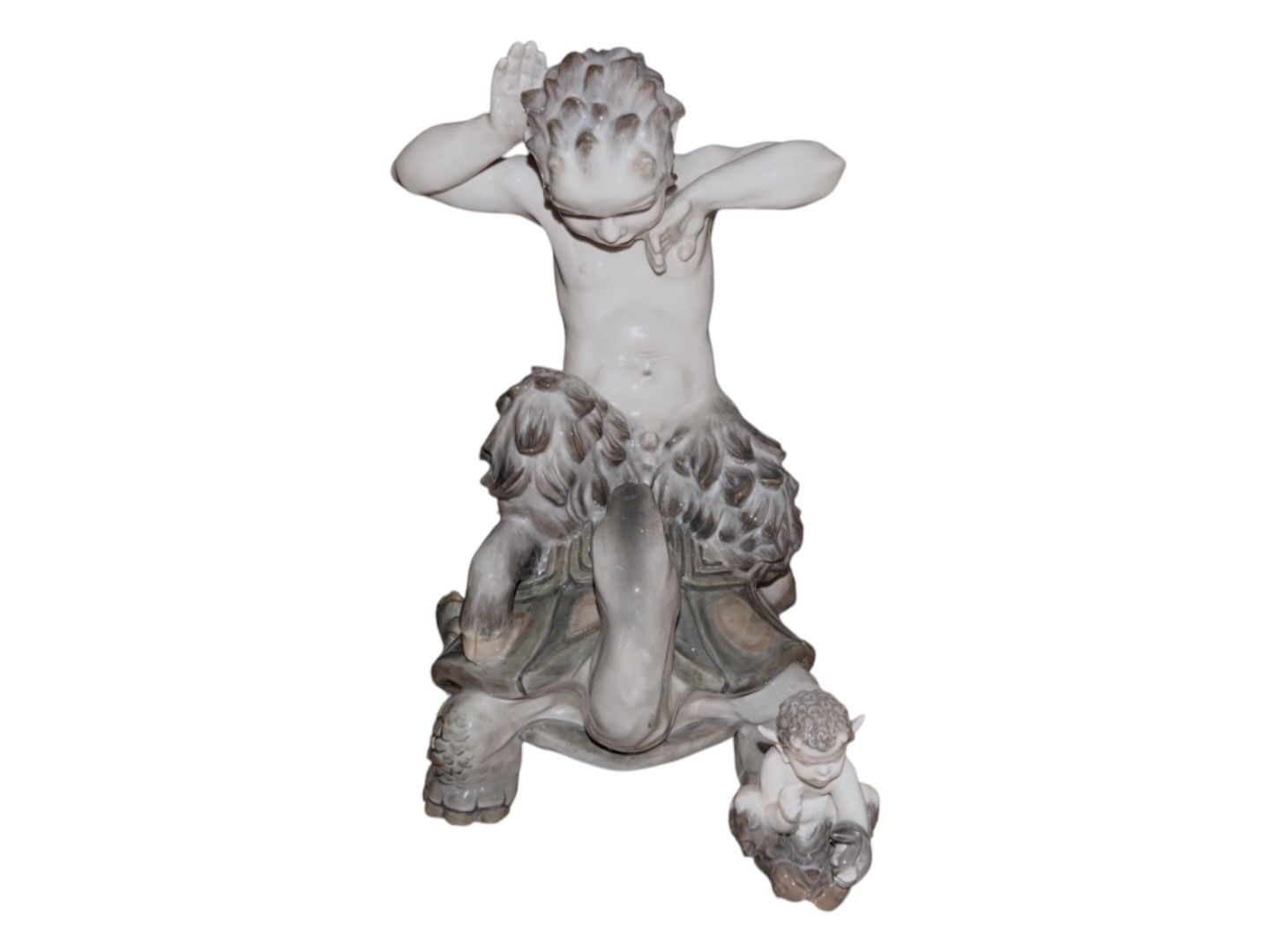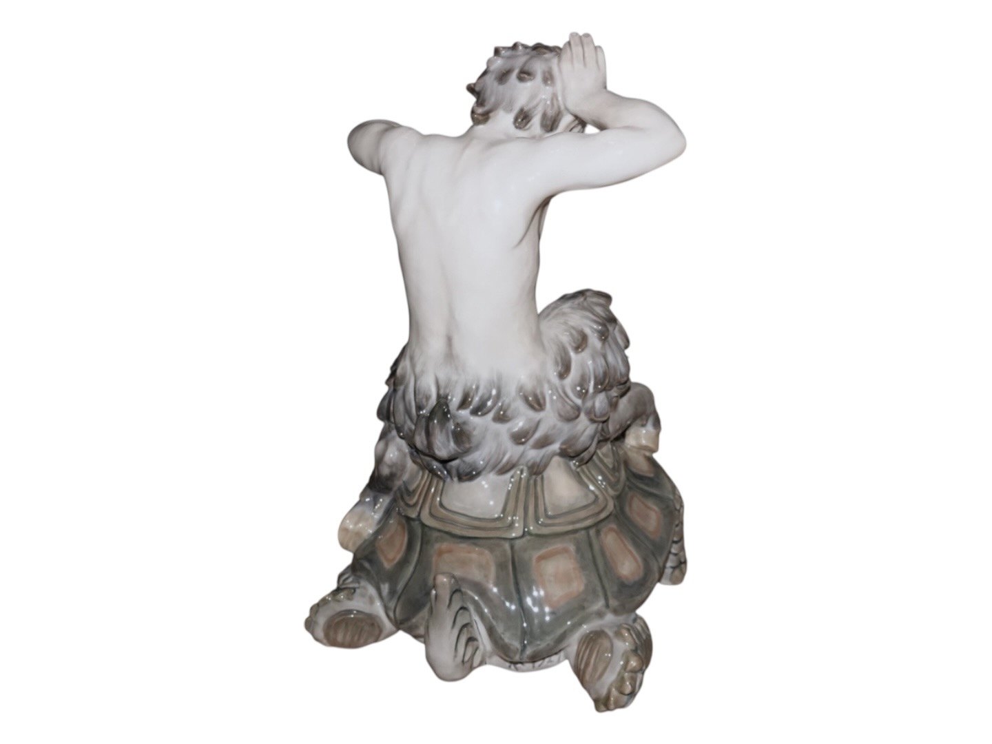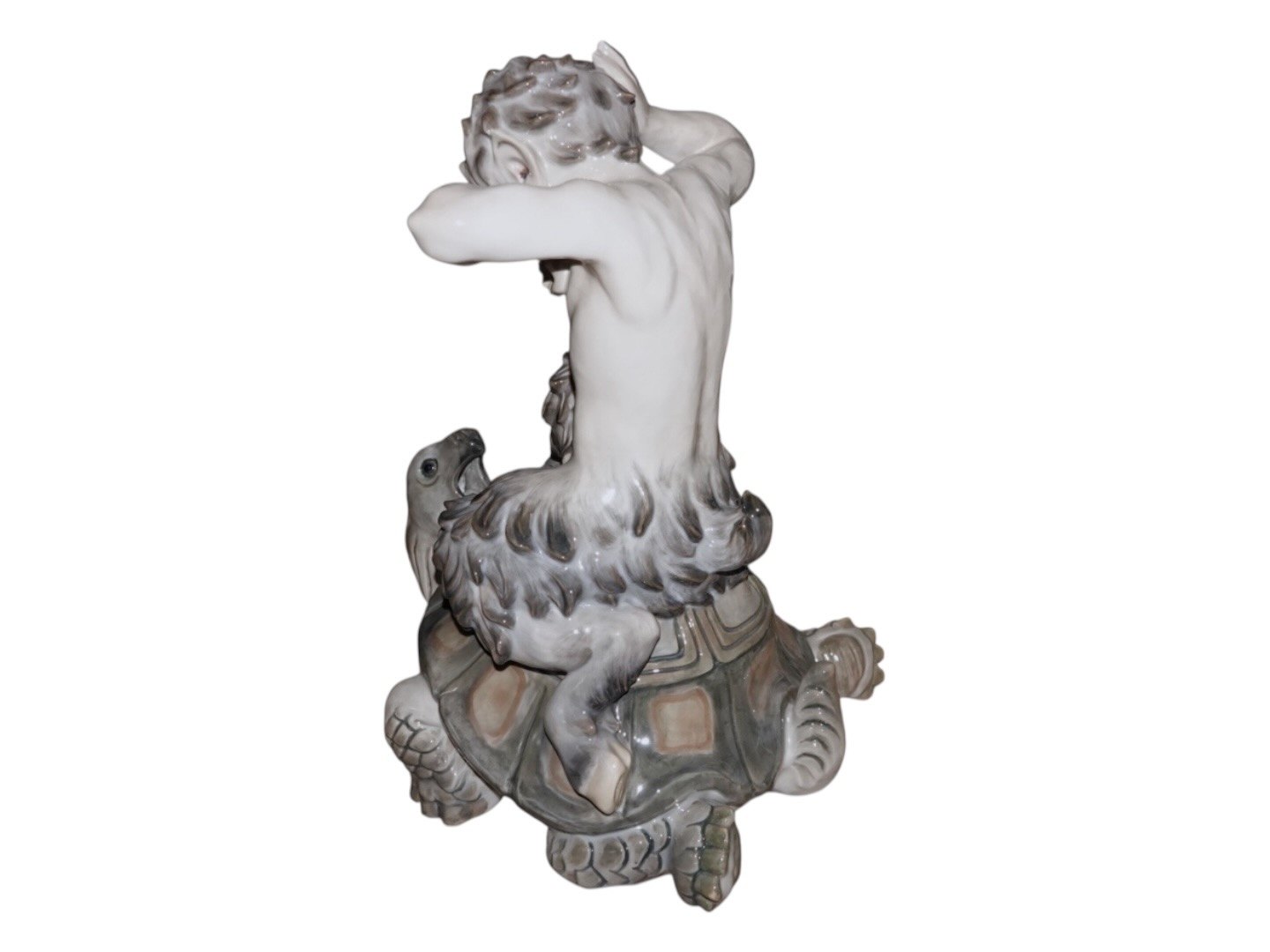 Meget sjælden kæmpe Royal Copenhagen figur, pan (faun) der kæmper med en skildpadde. På det første billede er der en "almindelig" pan figur for at illustrere størrelsesforskellen.