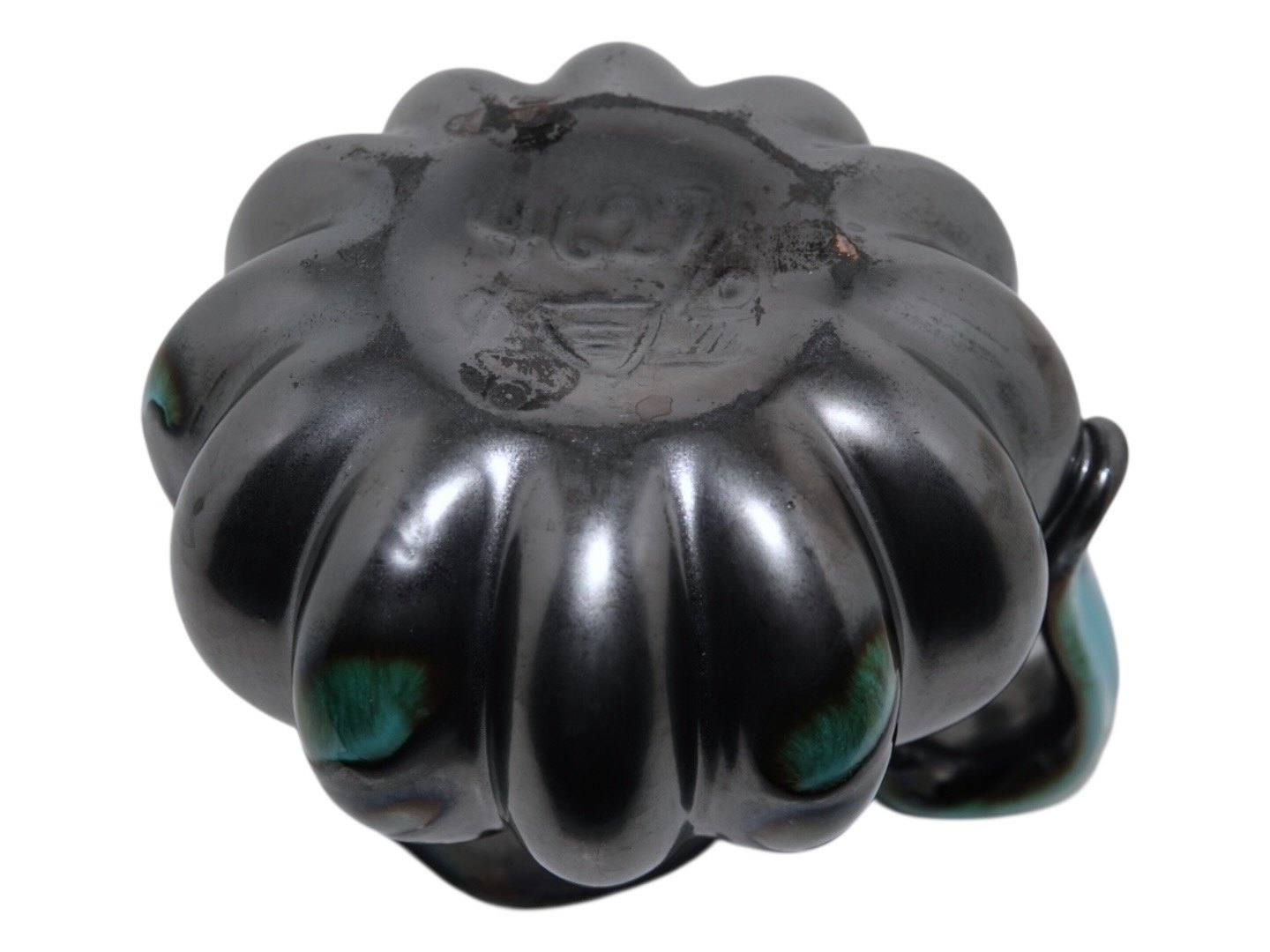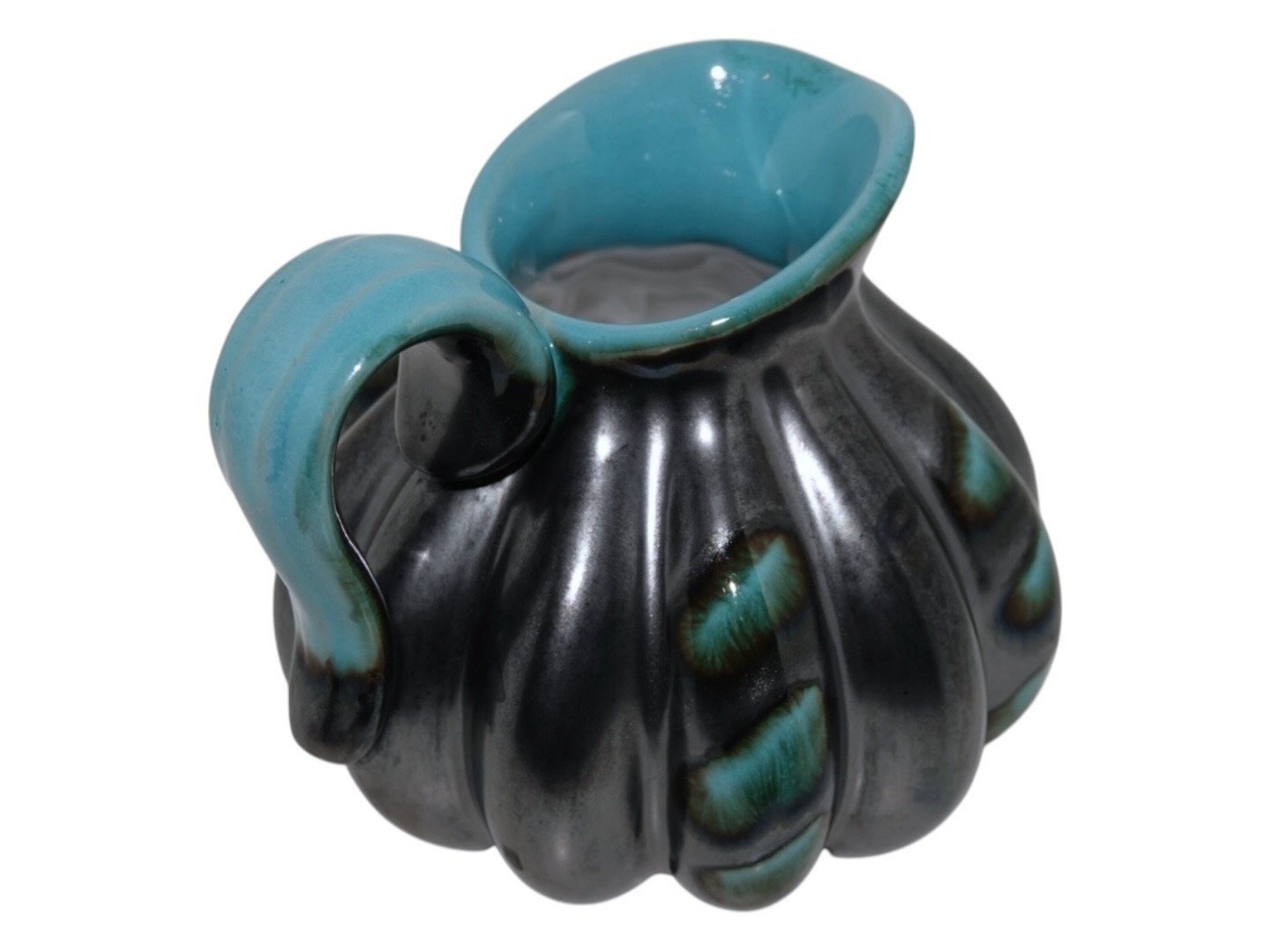 Michael Andersen keramik, lille græskarformet kande. Dekorationsnummer 4627. Længde 12,5 cm., højde 10,2 cm. inklusiv hanken. Perfekt stand uden fejl.