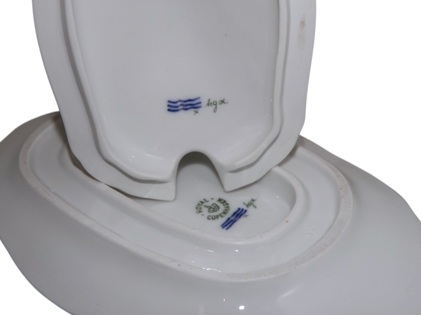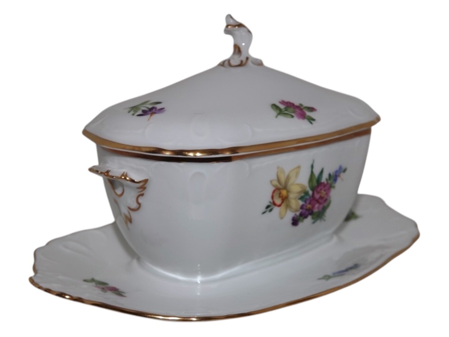Royal Copenhagen Let Saksisk Blomst, sjælden firkantet sovseskål med låg. Af fabriksmærket kan det udledes, at denne er produceret i mellem 1898 og 1923. 2. sortering. Længde 24,2 cm. Perfekt stand uden fejl.