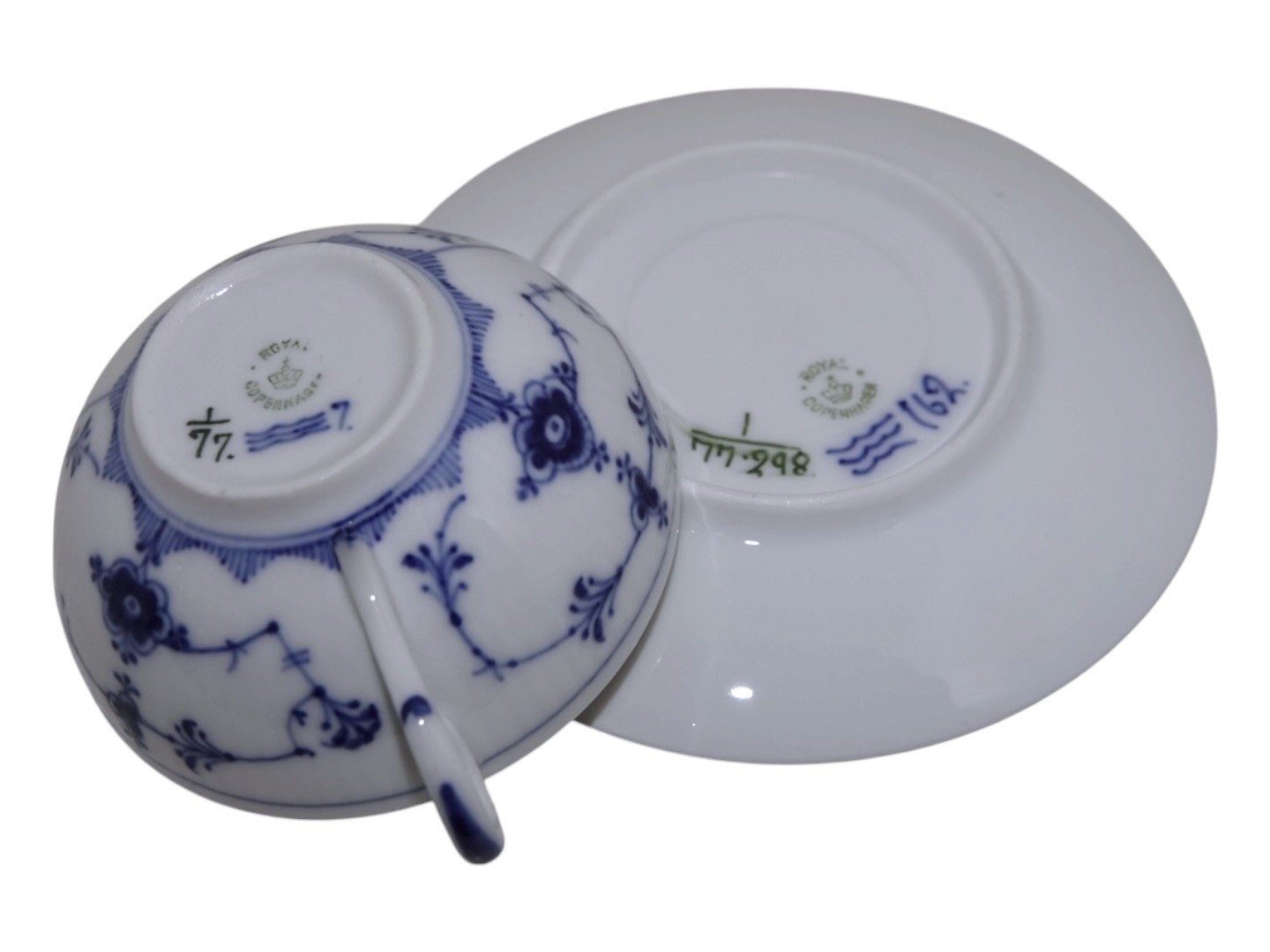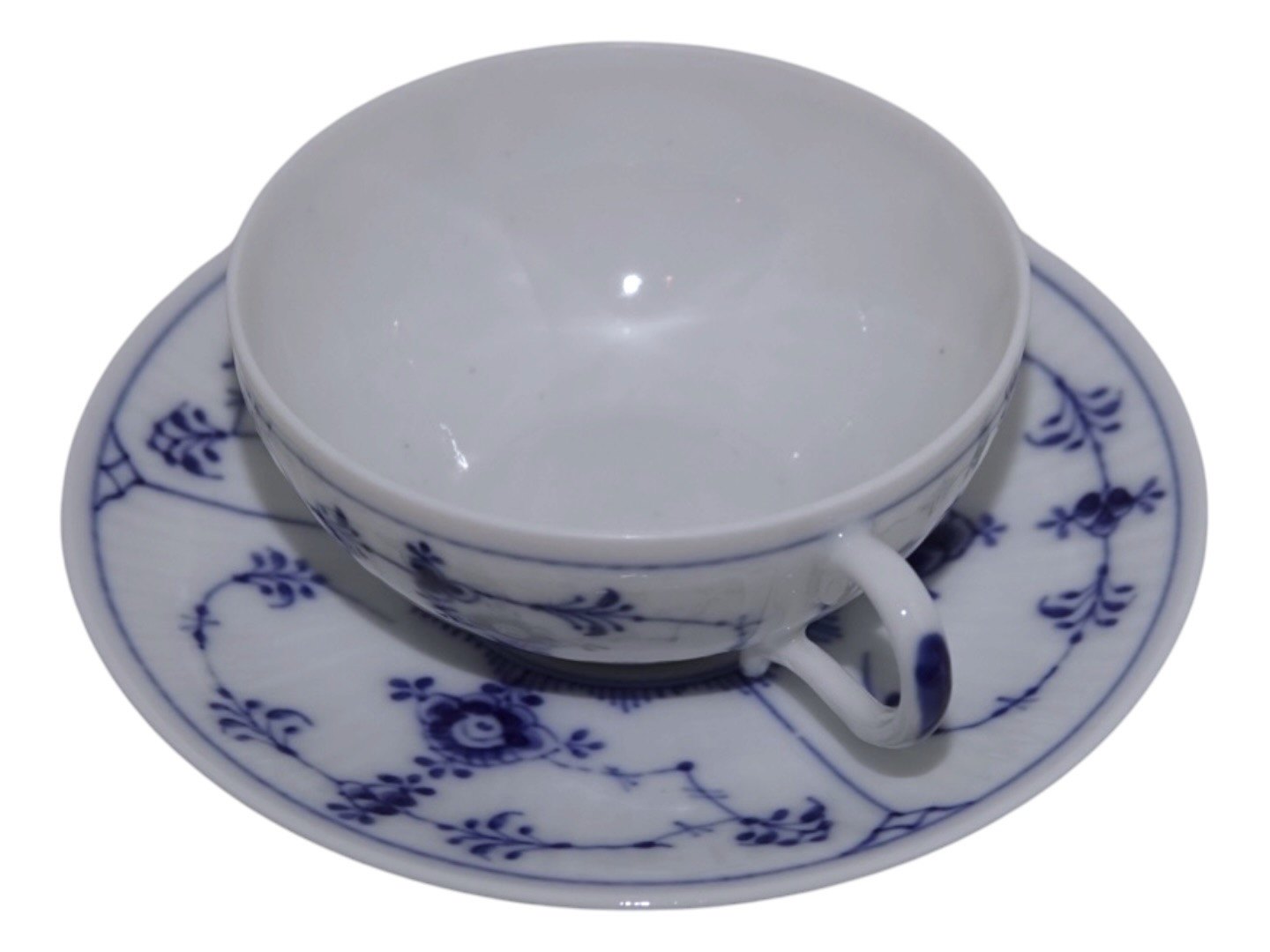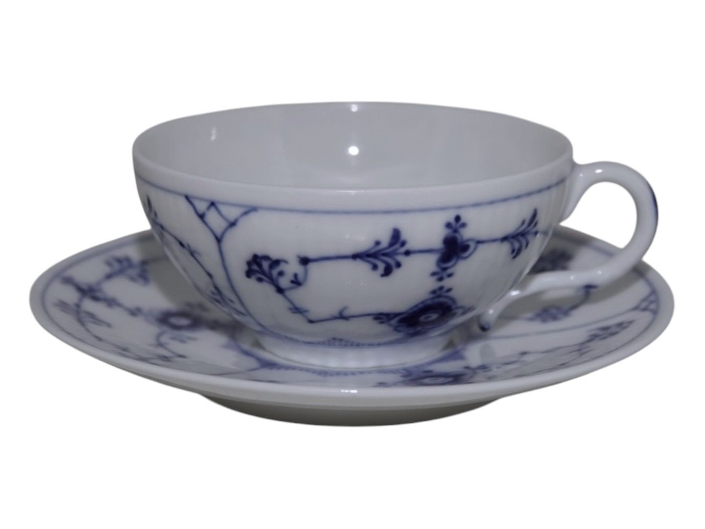 Royal Copenhagen Musselmalet Riflet, lille chokoladekop med tilhørende underkop.